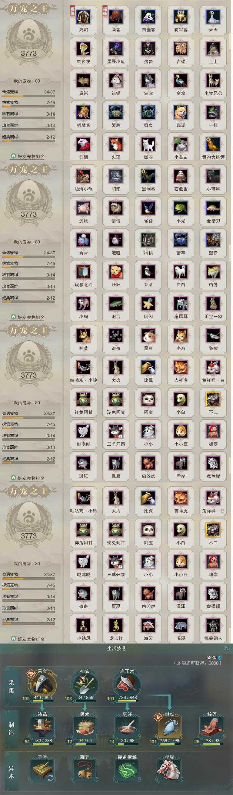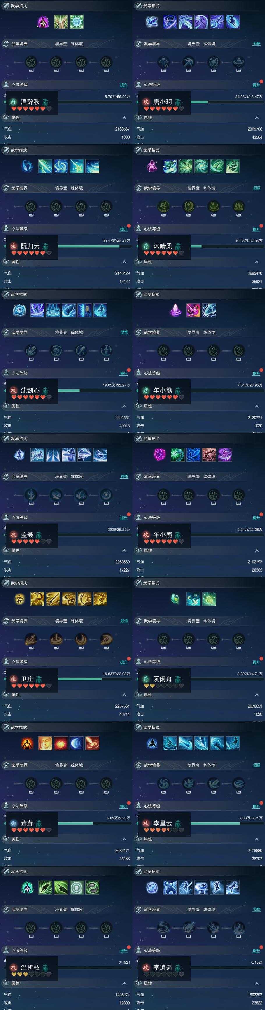 【同伴】温辞秋80级境界壹,唐小珂78级境界壹,阮归云78级境界壹,沐晴柔77级境界壹,沈剑心77级境界壹,年小熊75级境界壹,盖聂志74级境界壹,年小鹿73级境界壹,卫庄志73级境界壹,阮闲舟70级境界壹,茸茸志67级境界壹,李星云66级境界壹,温折枝1级境界壹,李逍遥1级境界壹
