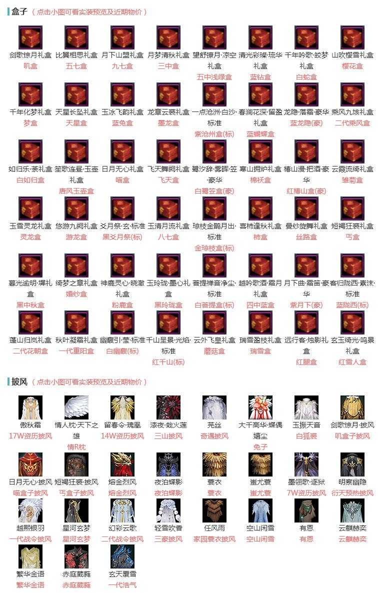 单盒成衣:[雪月盒衣, 猫盒衣, 黑谪仙衣, 三代元宵衣, 棋盒衣, 同人盒衣, 蓝游园衣, 紫人间盒衣, 羊盒衣, 除夕盒衣, 不良人衣, 白龙隐衣, 二代花朝衣]