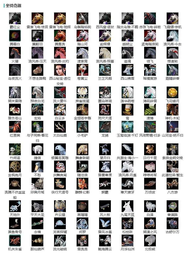 【坐骑】9个[踏炎不羁, 西风瘦逐狱, 赤珠碎岩, 飞霞骠惊帆, 浪风燕今古, 霸红尘, 雷首飞电惊辰, 雷首飞电驰辉, 乌鬃踏焰驹]