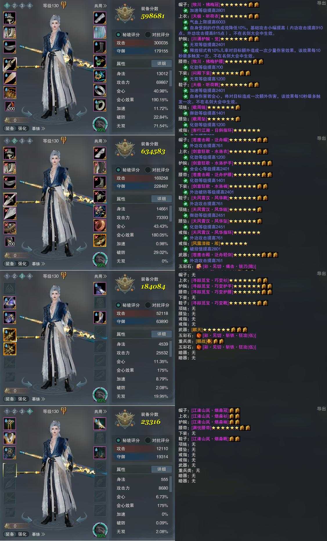 【装备】130级,山居剑意/问水诀PVE598681,山居剑意/问水诀PVP634583,装备三184084,装备四23316