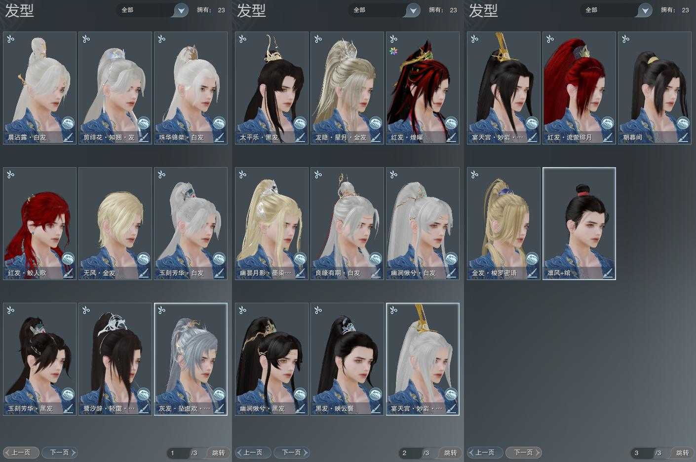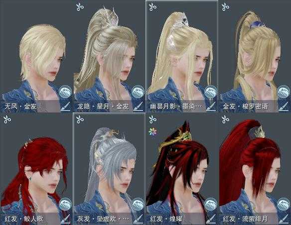 【发型】金发4个[资历金, 无风金发, 黑幽昙金发, 紫龙隐金发], 红发4个[兔红, 小资历红, 十五红, 三代灰金], 黑发7个, 白发7个, 盒子发型[黑狮黑发, 黑狮白发, 七七白发, 幽涧愀兮白发, 蓝鹭黑发], 总页数3