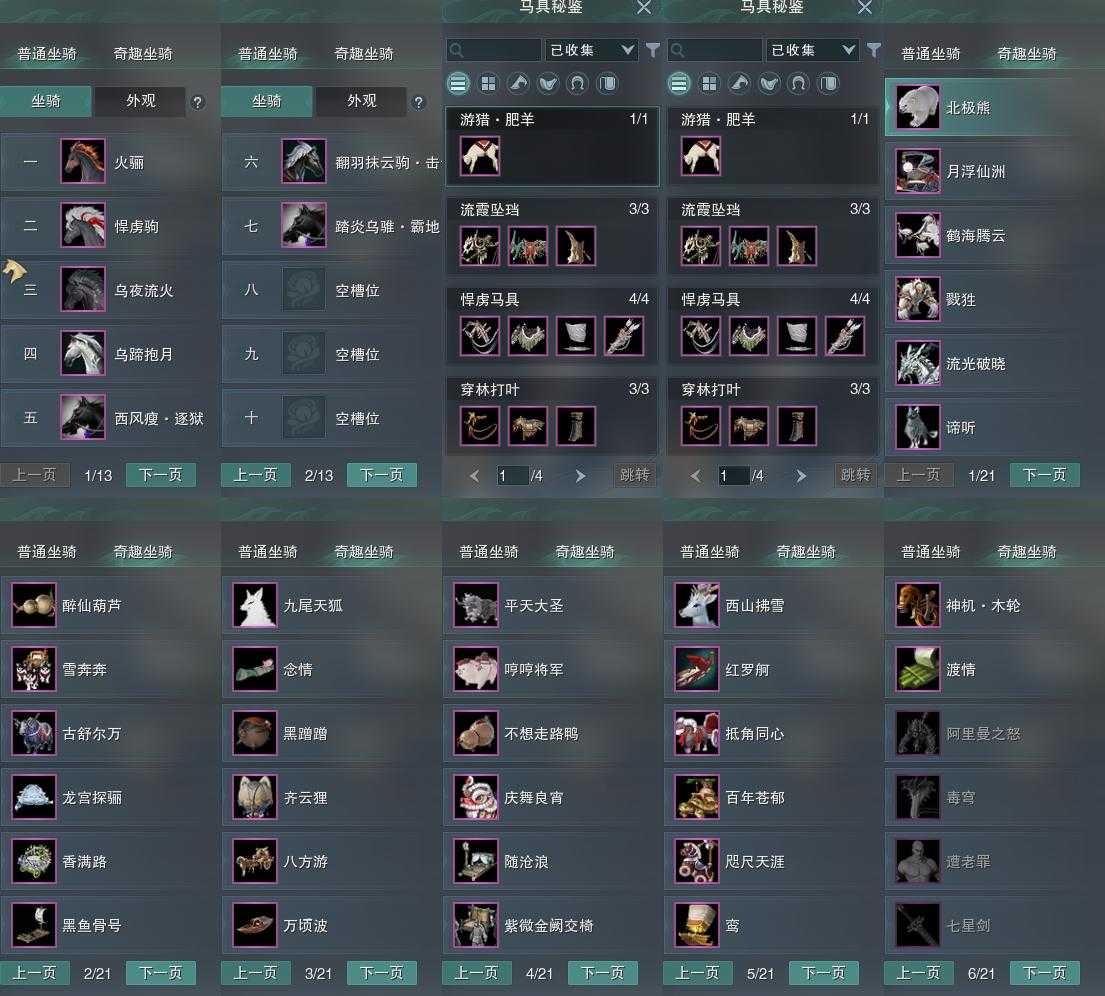 【坐骑】7个[踏炎霸地, 西风瘦逐狱, 翻羽抹云驹击云, 乌蹄抱月]