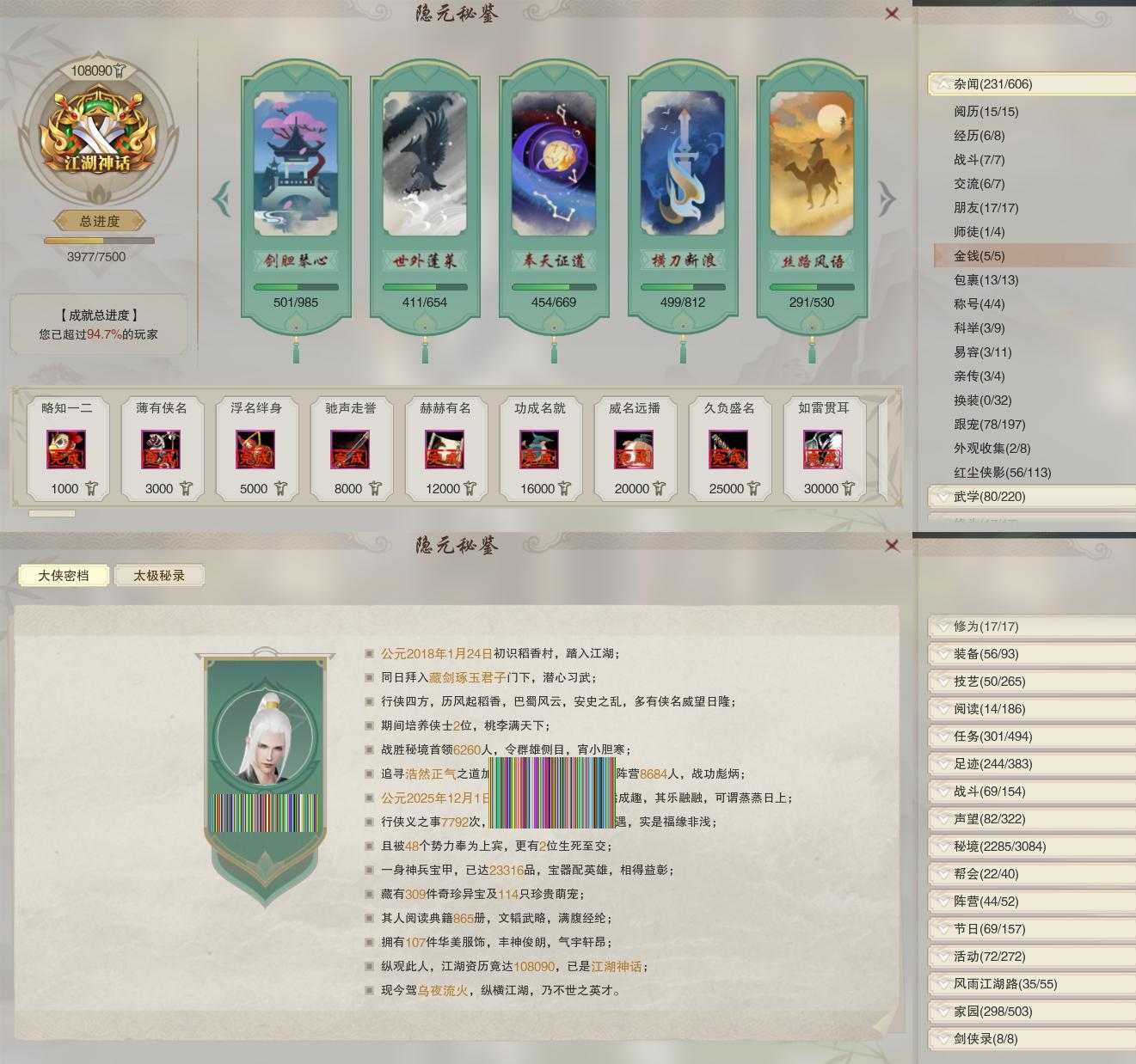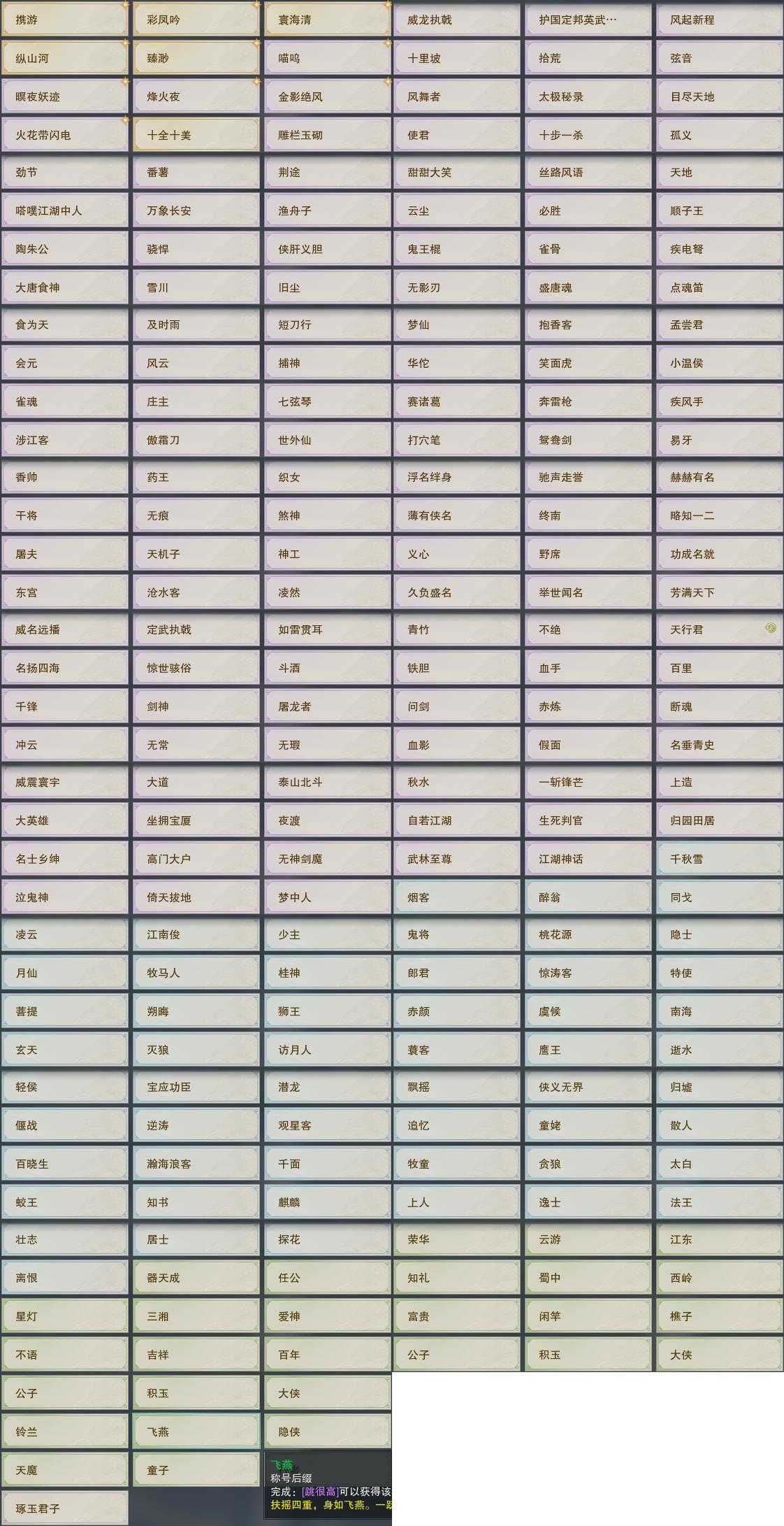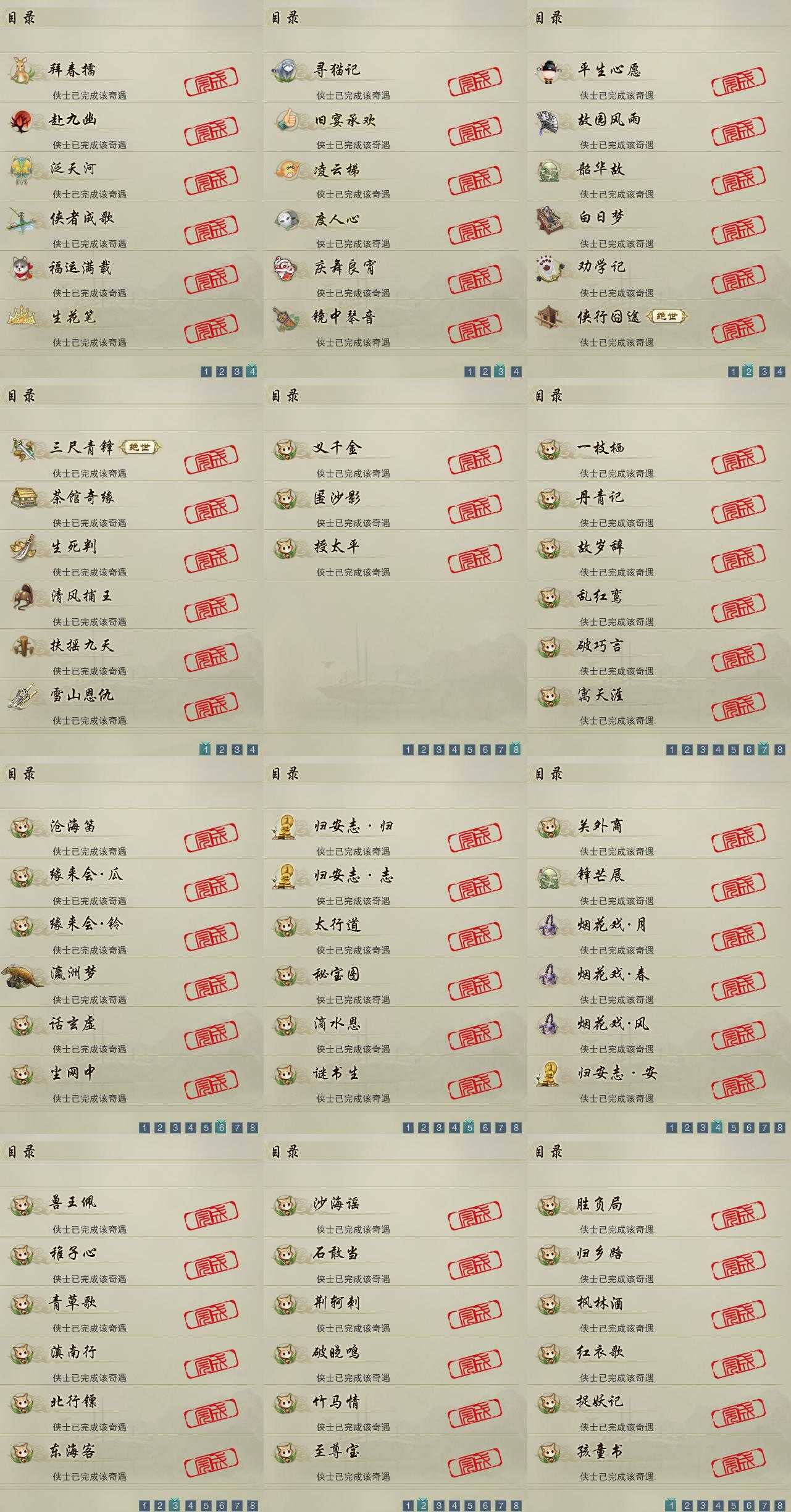 【奇遇】24个[白日梦, 劝学记, 雪山恩仇, 平生心愿, 韶华故, 故园风雨, 三尺青锋, 扶摇九天, 清风捕王, 寻猫记, 侠行囧途, 茶馆奇缘, 庆舞良宵, 生死判, 凌云梯, 赴九幽, 度人心, 旧宴承欢, 泛天河, 镜中琴音, 侠者成歌, 拜春擂, 福运满载, 生花笔]