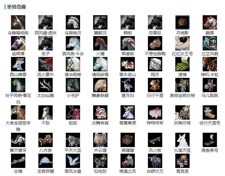 【坐骑】4个[西风瘦逐狱, 乌蹄抱月, 浪风燕今古, 乌鬃踏焰驹]