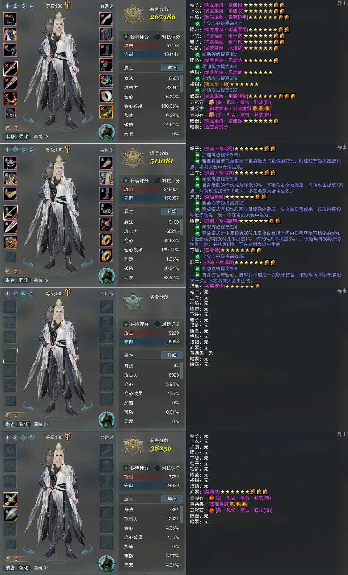 【装备】130级,装备一267486,山居剑意/问水诀PVE511081,装备三0,装备四38256