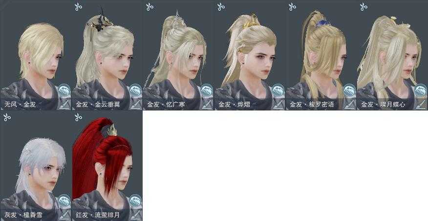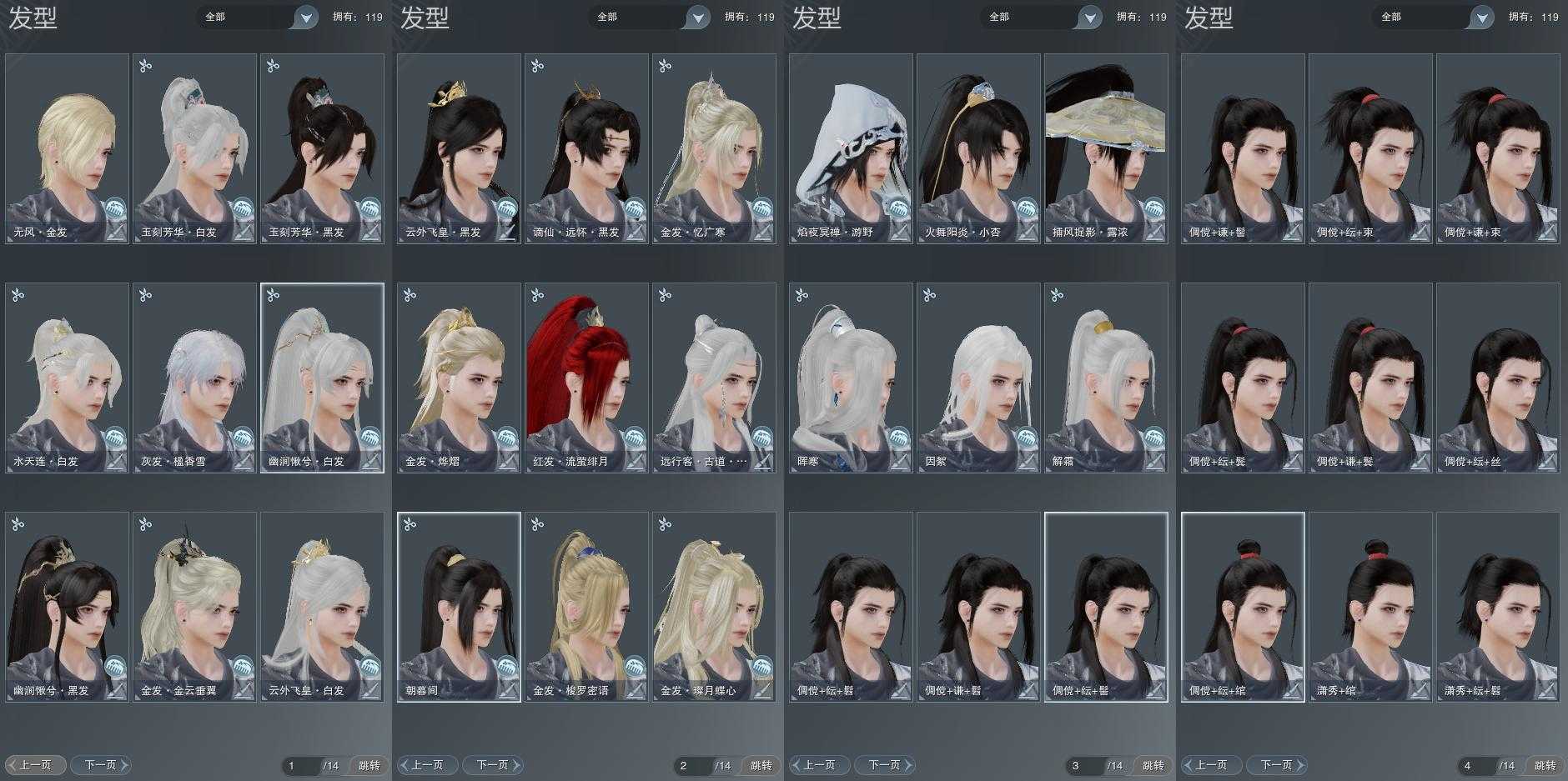 【发型】金发6个[狐金, 兔金, 资历金, 猪金, 苍金, 无风金发], 红发2个[小资历红, 一代灰], 黑发9个, 白发7个, 盒子发型[黑谪仙黑发, 飞皇黑发, 飞皇白发, 幽涧愀兮白发], 总页数4