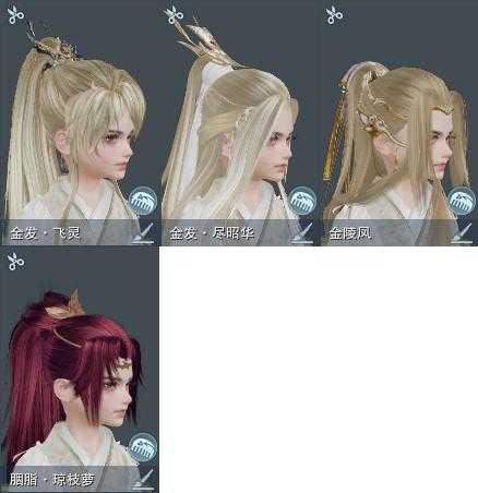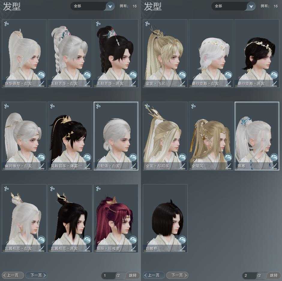 【发型】金发3个[一代金, 中秋金, 飒金], 红发1个[紫发], 黑发5个, 白发7个, 盒子发型[丝路黑, 丝路白, 五代七夕黑发, 五代七夕白发, 薄雾黑发, 月轻语白发, 幽涧愀兮白发], 总页数2