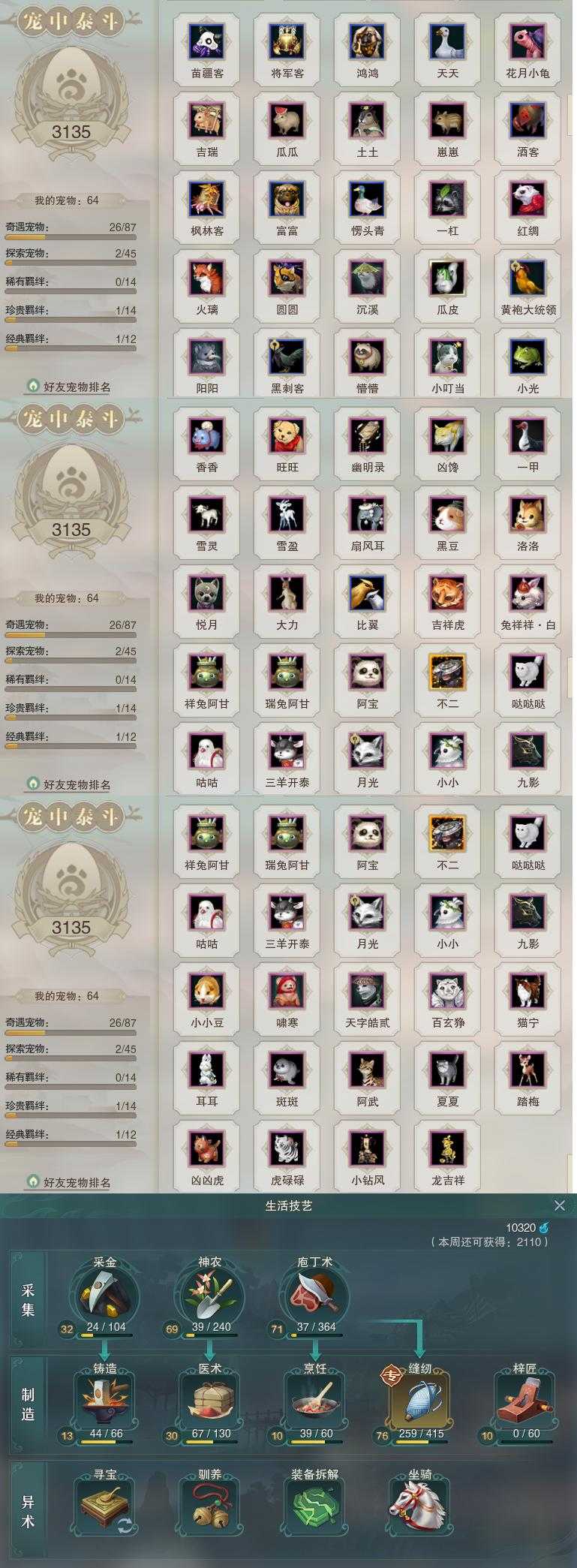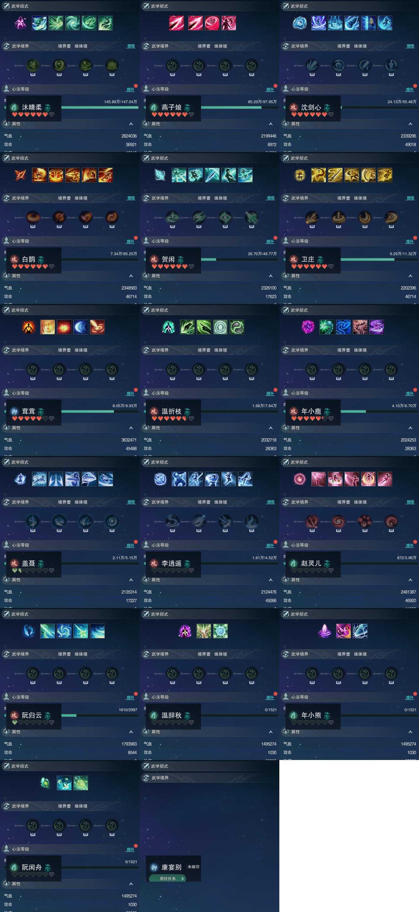 【同伴】沐晴柔87级境界壹,燕子娘84级境界壹,沈剑心81级境界壹,白鹊志81级境界壹,贺闲志79级境界壹,卫庄志68级境界壹,茸茸志67级境界壹,温折枝65级境界壹,年小鹿64级境界壹,盖聂志62级境界壹,李逍遥61级境界壹,赵灵儿60级境界壹,阮归云37级境界壹,温辞秋1级境界壹,年小熊1级境界壹,阮闲舟1级境界壹,康宴别级