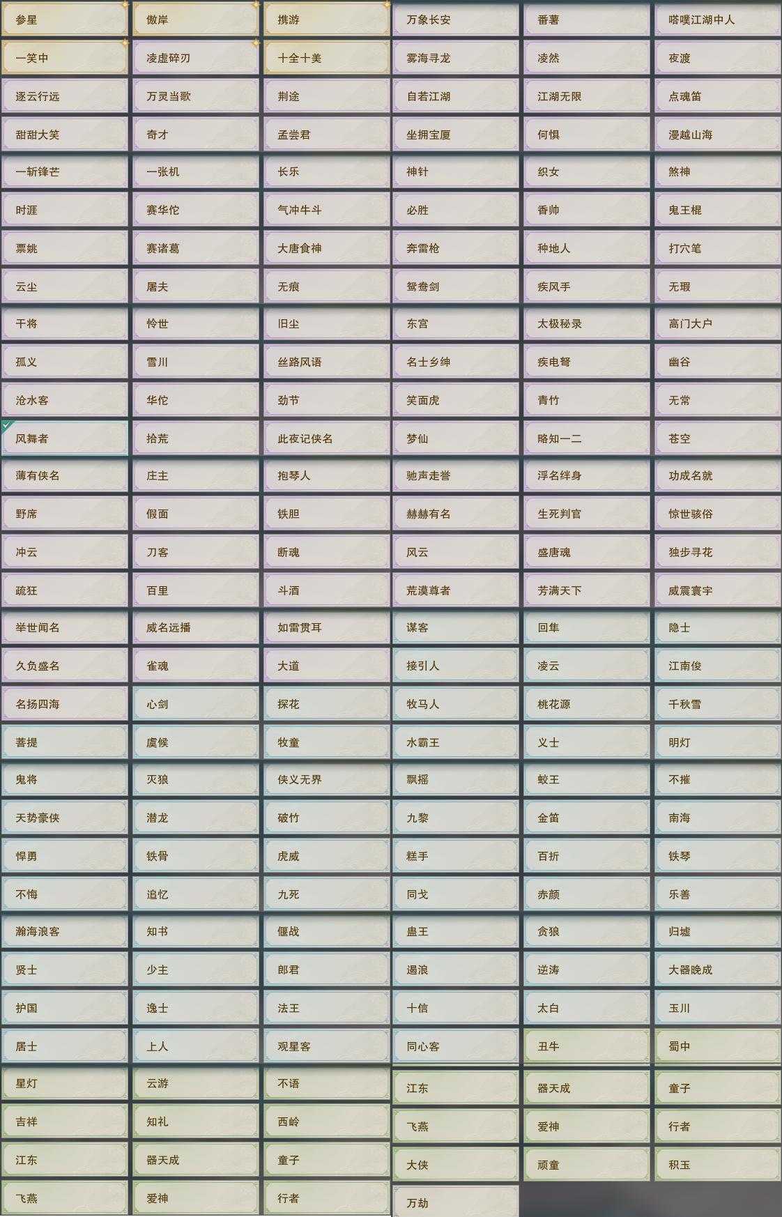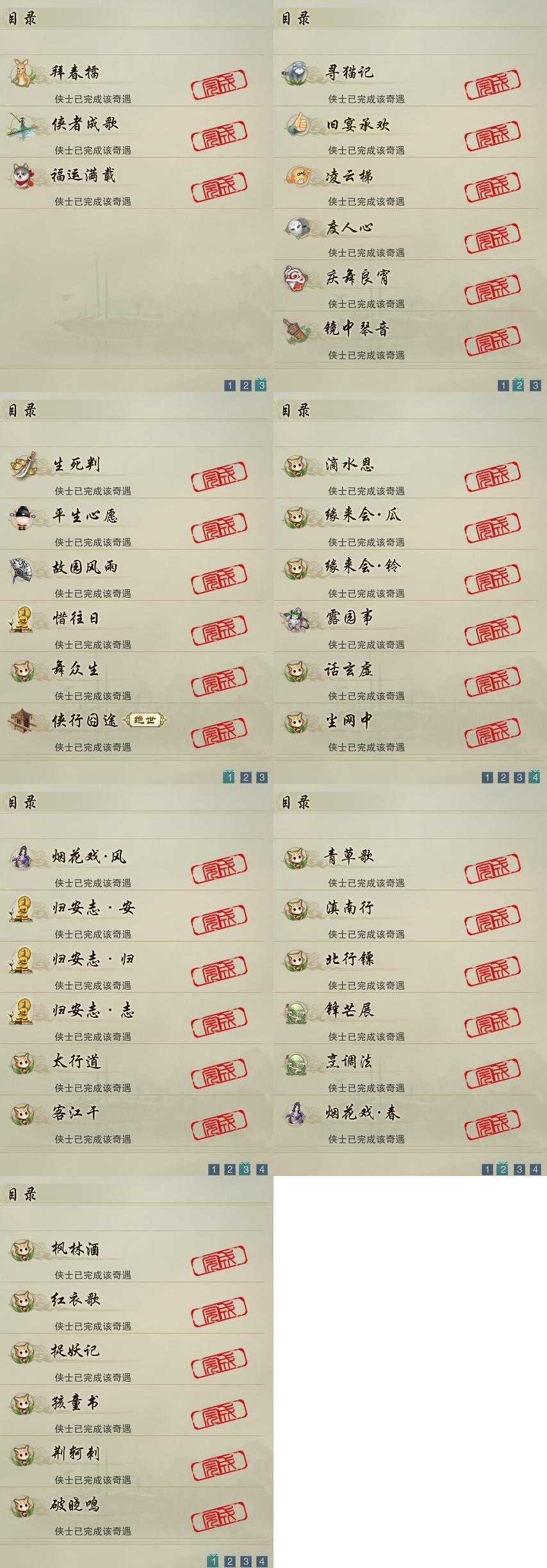 【奇遇】15个[平生心愿, 惜往日, 故园风雨, 舞众生, 寻猫记, 侠行囧途, 庆舞良宵, 生死判, 凌云梯, 度人心, 旧宴承欢, 镜中琴音, 侠者成歌, 拜春擂, 福运满载]