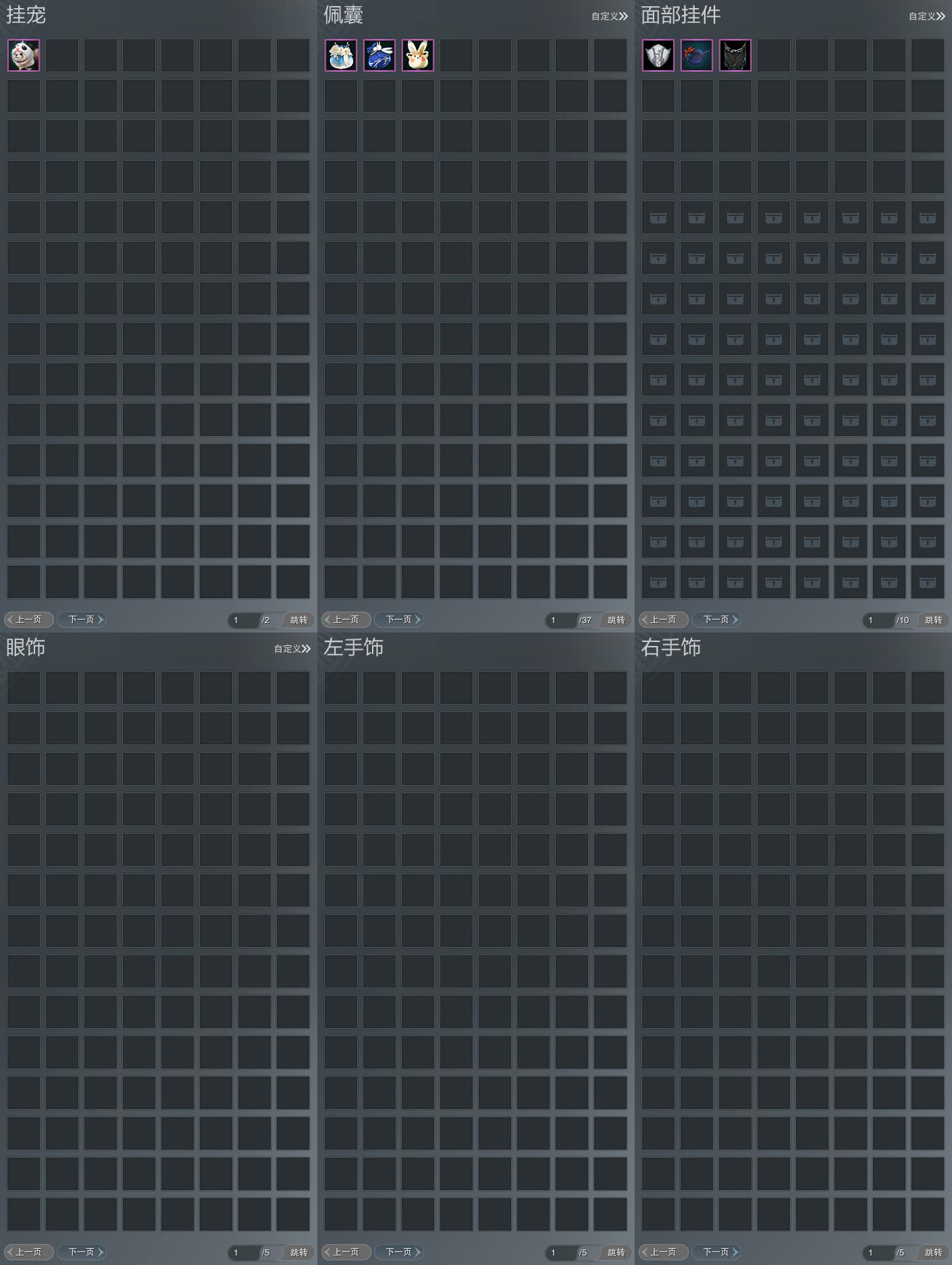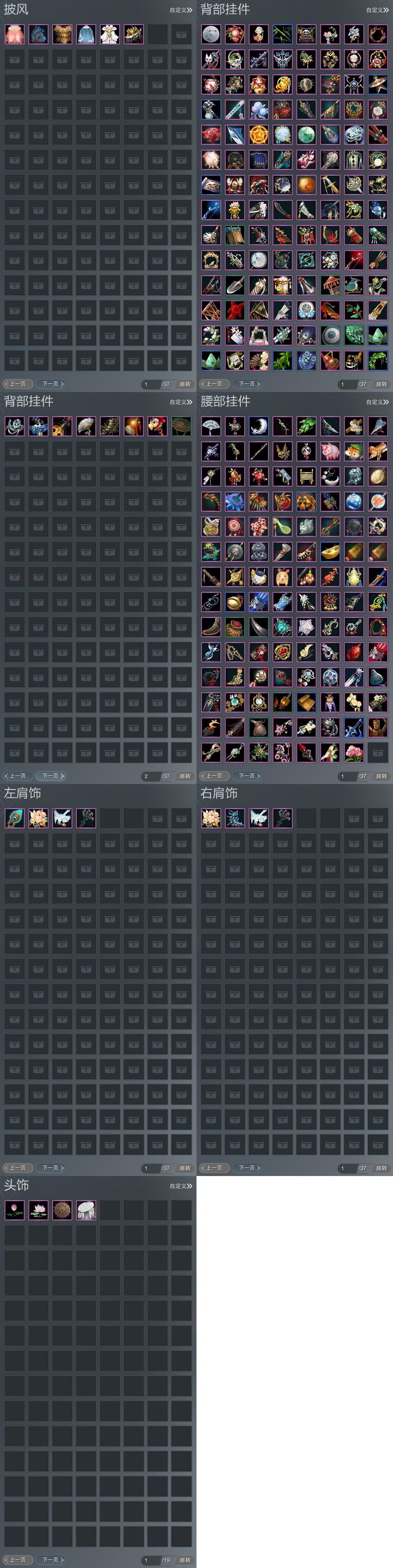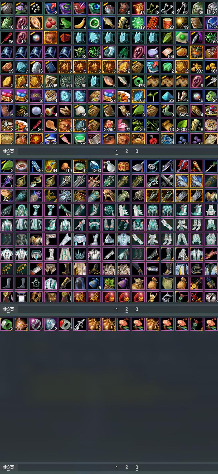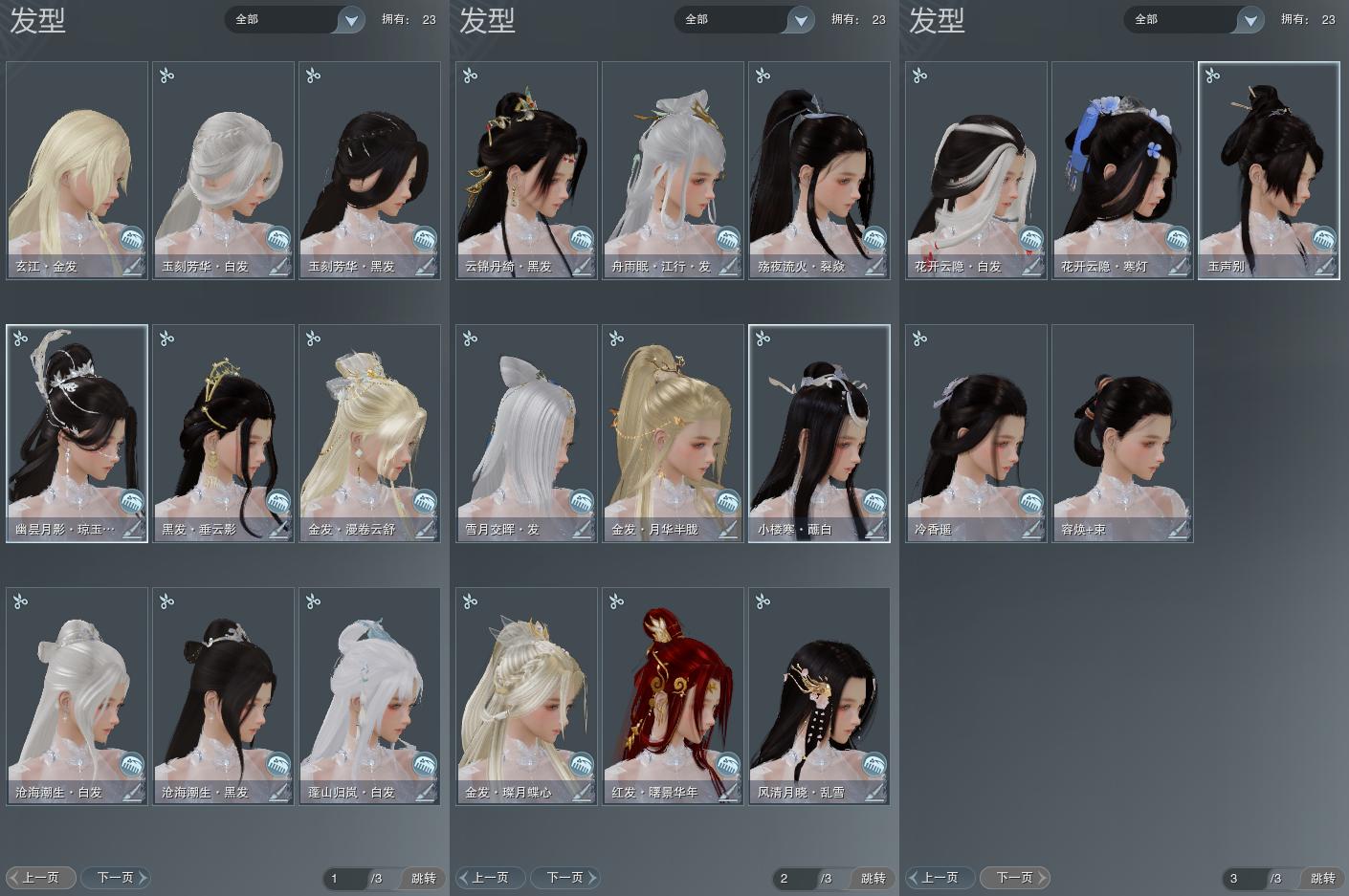 【发型】金发4个[狐金, 鸡金, 云金, 玄江金发], 红发1个[猴红], 黑发10个, 白发6个, 盒子发型[一代花朝绿白, 雪月白发, 二代花朝白, 沧海黑发, 沧海白发, 白幽昙黑发], 总页数3