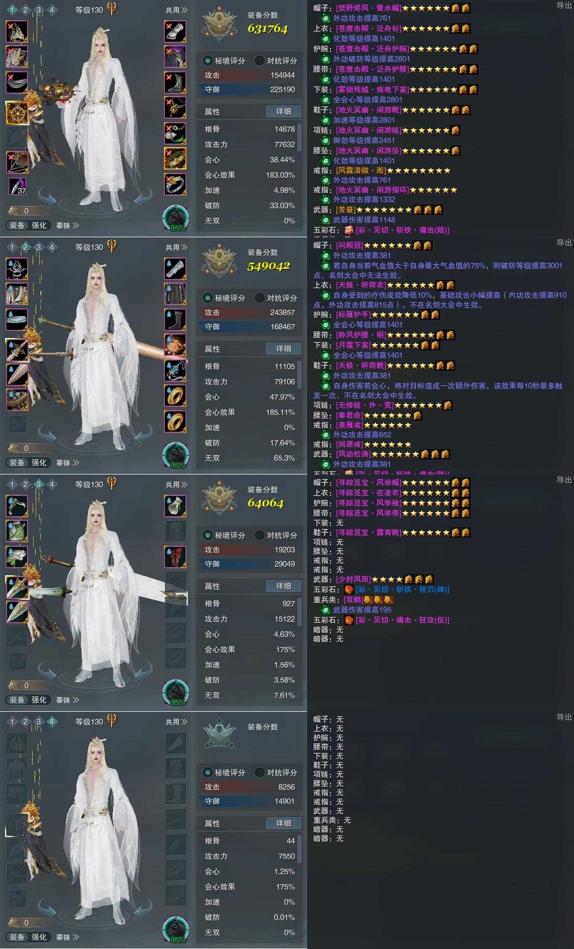 【装备】130级,山居剑意/问水诀PVP631764,山居剑意/问水诀PVE549042,装备三64064,装备四0