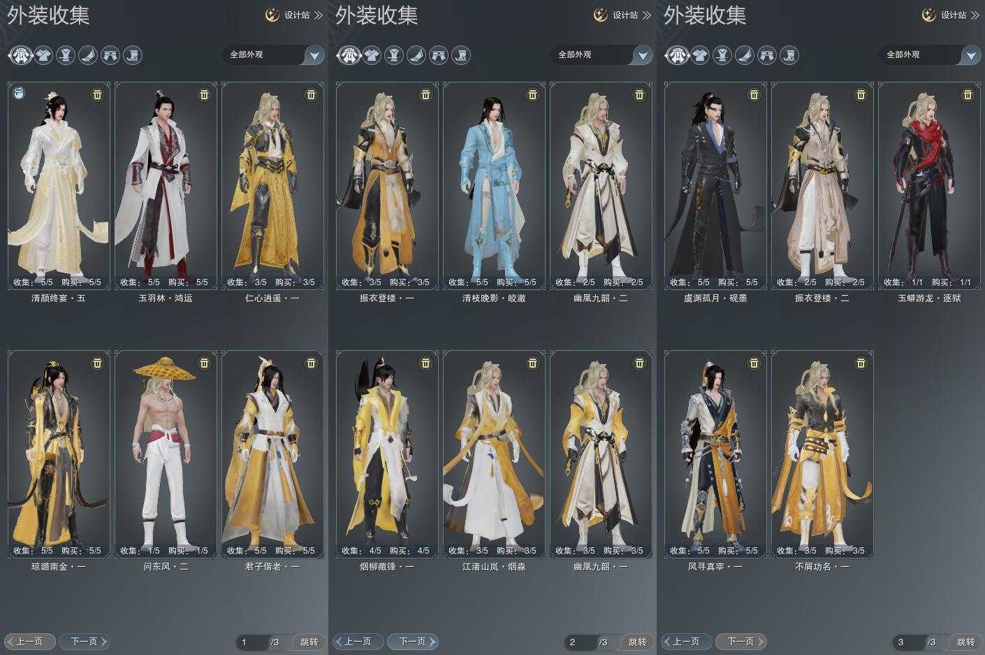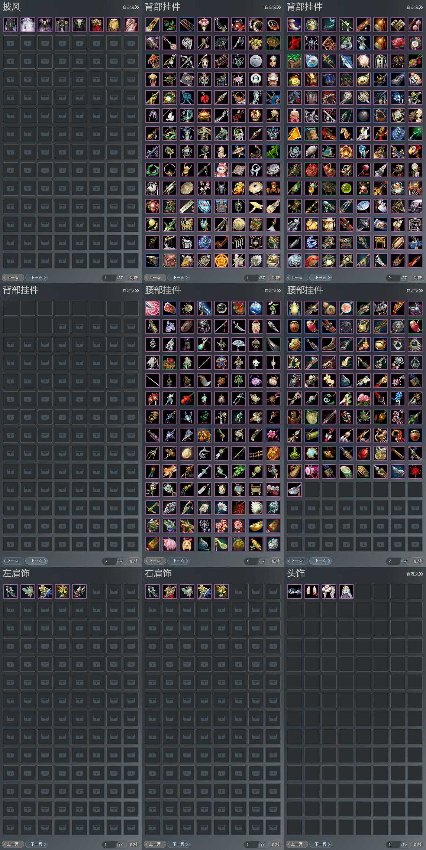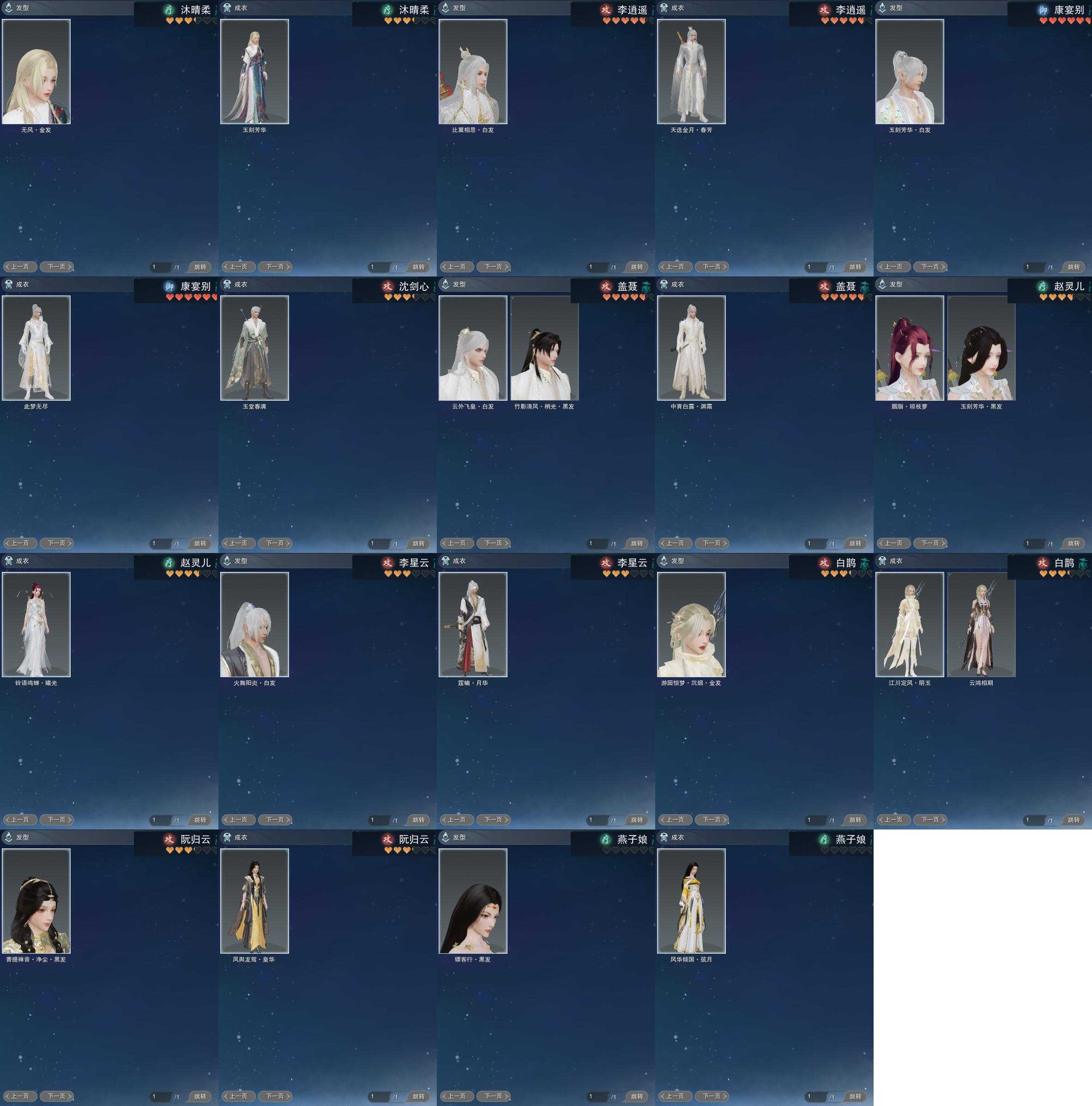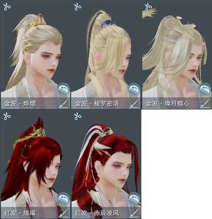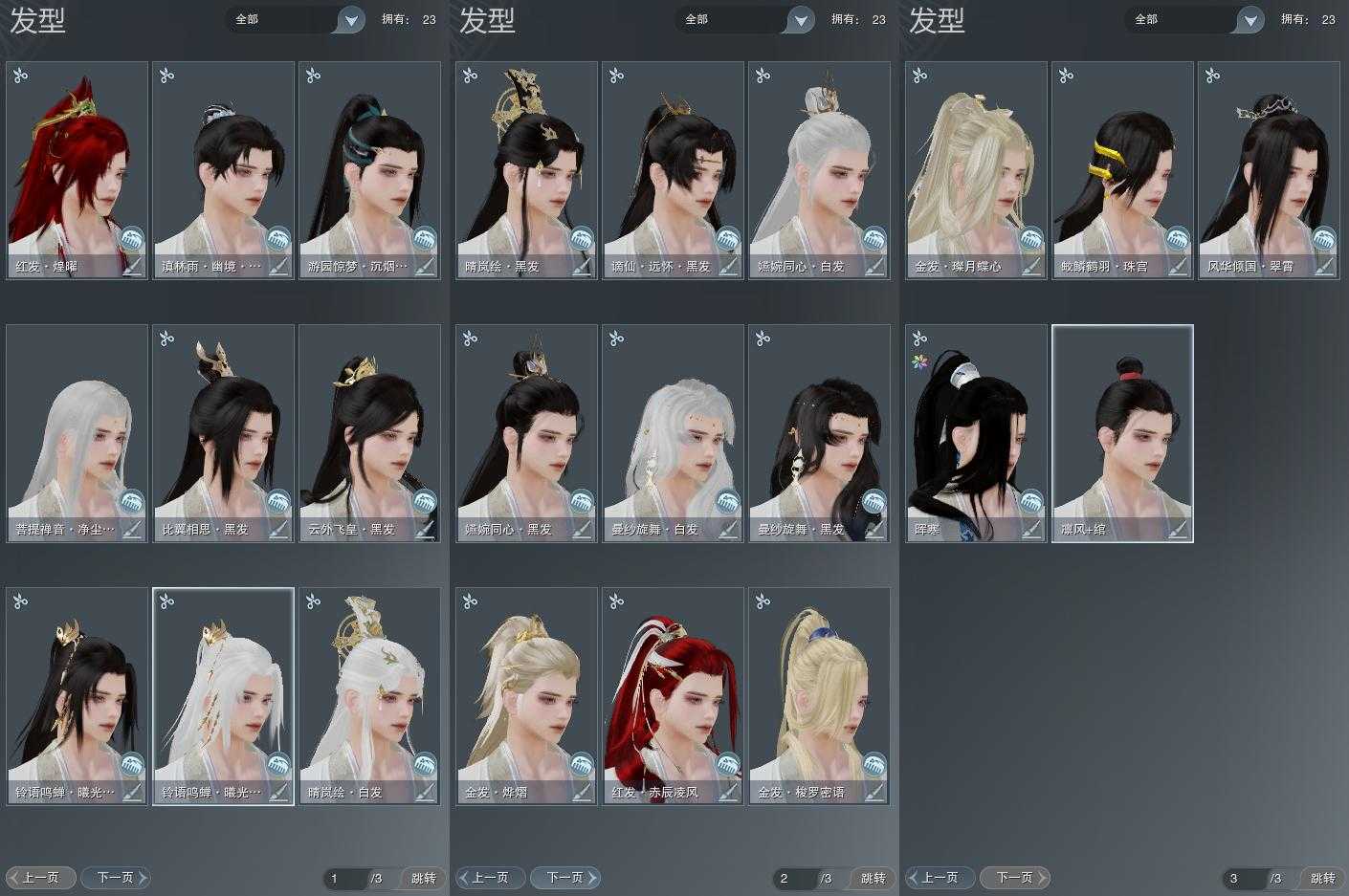【发型】金发5个[狐金, 资历金, 猪金, 无风金发, 绿游园金发], 红发3个[八红, 紫发, 兔红], 黑发15个, 白发10个, 盒子发型[丝路黑, 四代七夕黑发, 黑谪仙黑发, 晴岚绘黑发, 白楼兰黑发, 丝路白, 四代七夕白发, 飞皇黑发, 五代七夕黑发, 晴岚绘白发, 白楼兰白发, 净尘黑发, 飞皇白发, 五代七夕白发, 净尘白发, 绿游园黑发, 竹影梢光黑发, 镖盒黑发, 黑傣族黑发], 总页数3