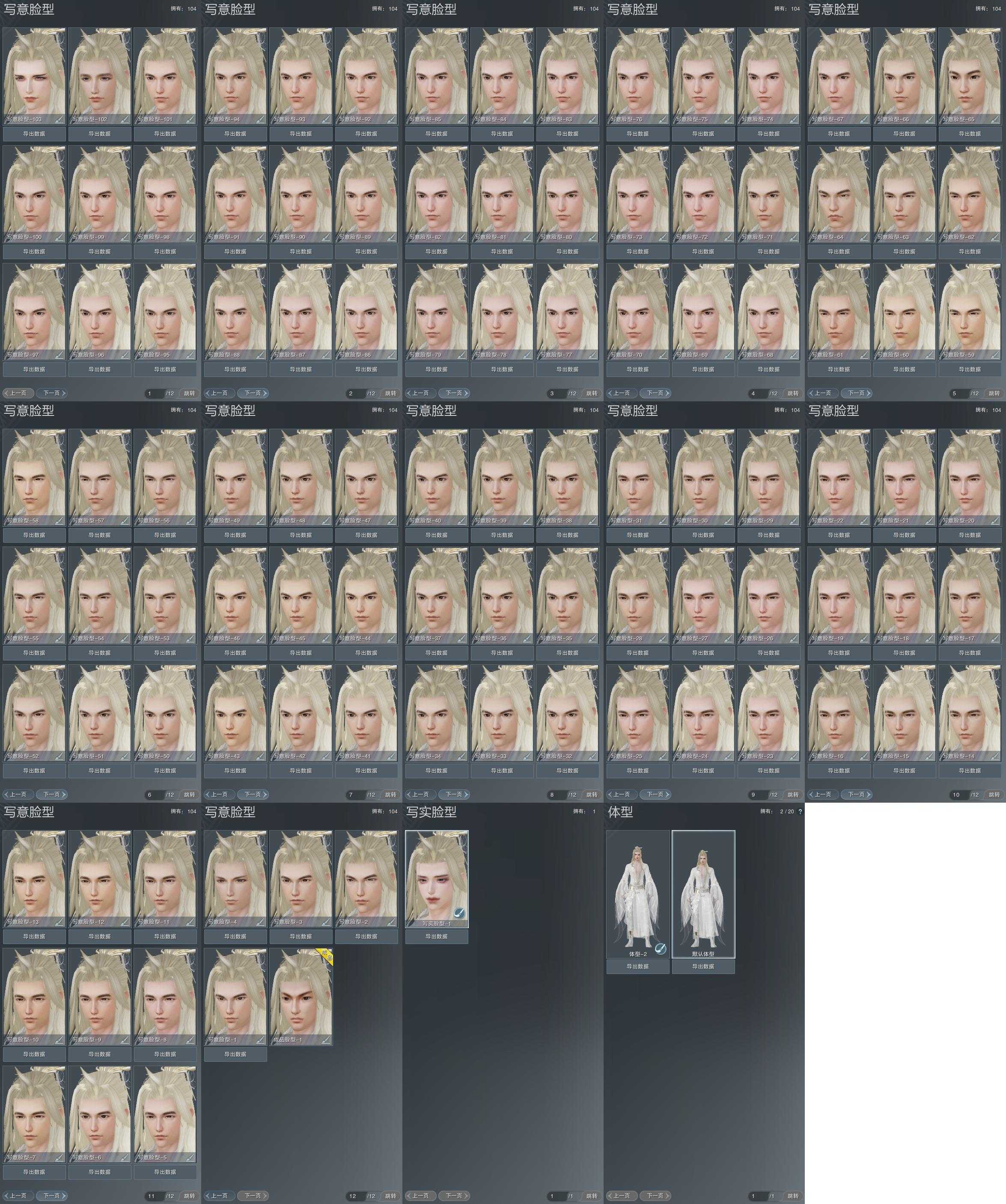 【捏脸】写意脸型104个,写实脸型1个,体型2个