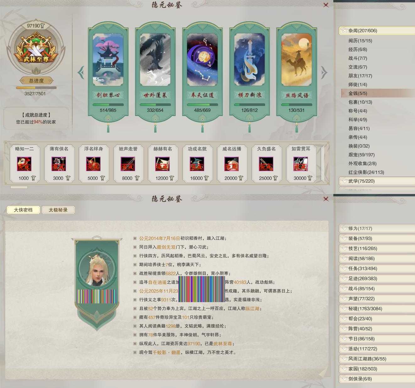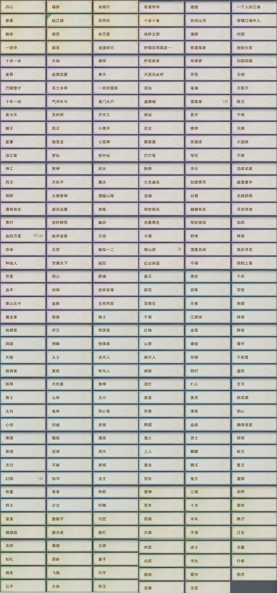 【称号】[纵江湖, 侠万里, 夜昙帝华, 凌虚碎刃, 焜煌]