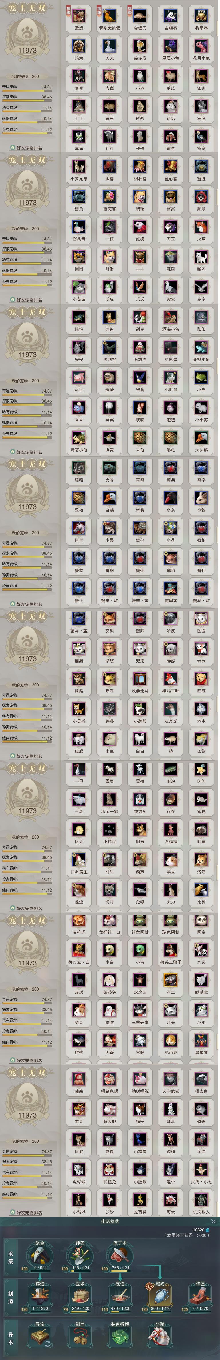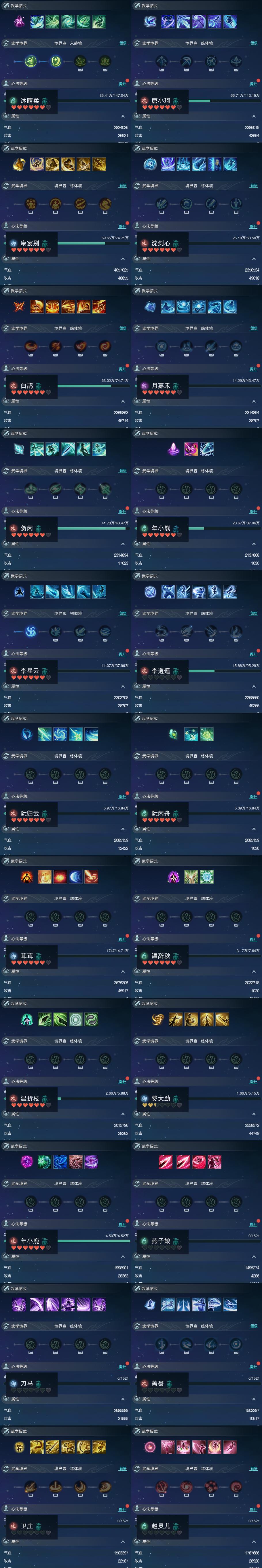 【同伴】沐晴柔87级境界叁,唐小珂85级境界壹,康宴别82级境界壹,沈剑心82级境界壹,白鹊志82级境界壹,月嘉禾78级境界壹,贺闲志78级境界壹,年小熊77级境界壹,李星云77级境界贰,李逍遥74级境界壹,阮归云71级境界壹,阮闲舟71级境界壹,茸茸志70级境界壹,温辞秋65级境界壹,温折枝63级境界壹,费大劲62级境界壹,年小鹿61级境界壹,燕子娘1级境界壹,刀马志1级境界壹,盖聂志1级境界壹,卫庄志1级境界壹,赵灵儿1级境界壹