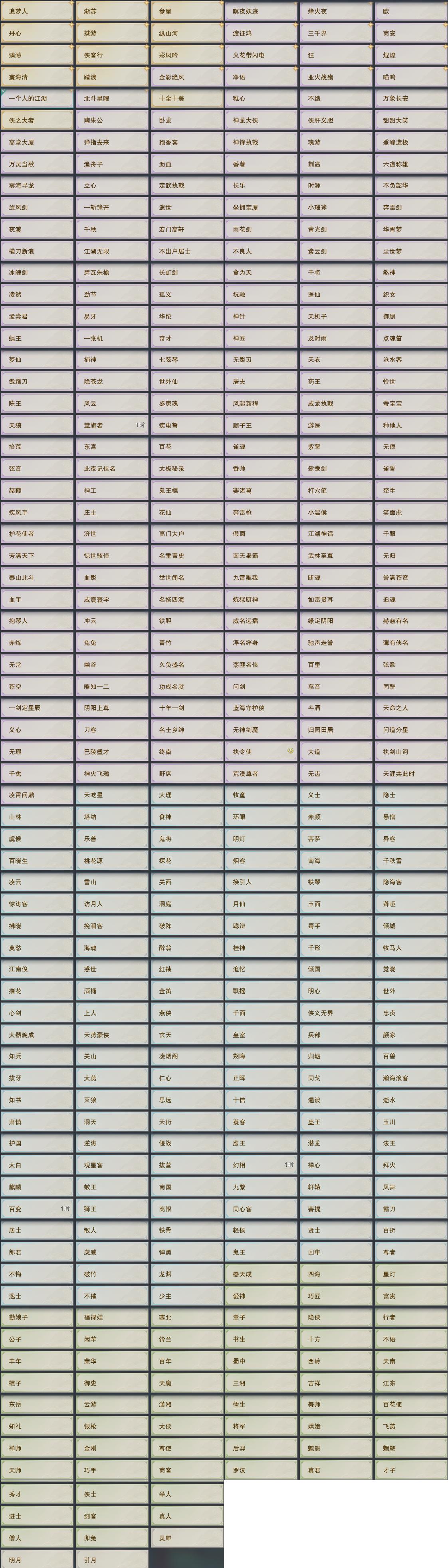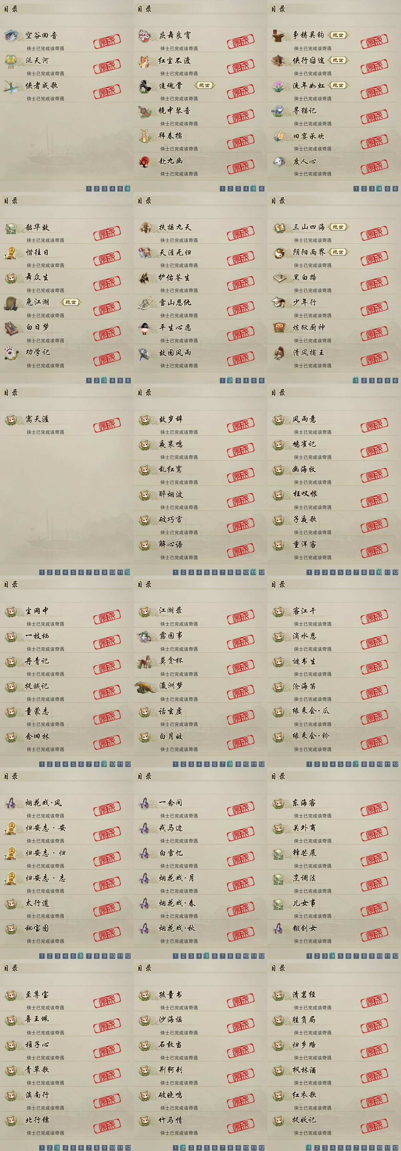 【奇遇】33个[白日梦, 天涯无归, 三山四海, 劝学记, 雪山恩仇, 阴阳两界, 兔江湖, 平生心愿, 黑白路, 惜往日, 争铸吴钩, 韶华故, 护佑苍生, 少年行, 扶摇九天, 故园风雨, 流年如虹, 舞众生, 清风捕王, 侠行囧途, 寻猫记, 庆舞良宵, 炼狱厨神, 追魂骨, 赴九幽, 度人心, 空谷回音, 旧宴承欢, 泛天河, 镜中琴音]