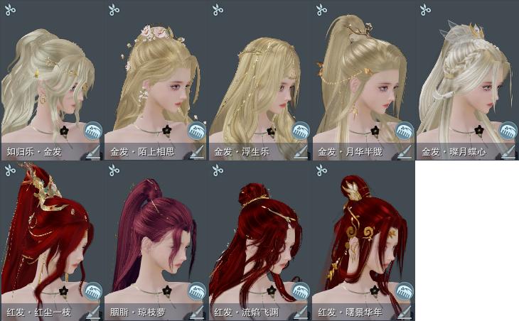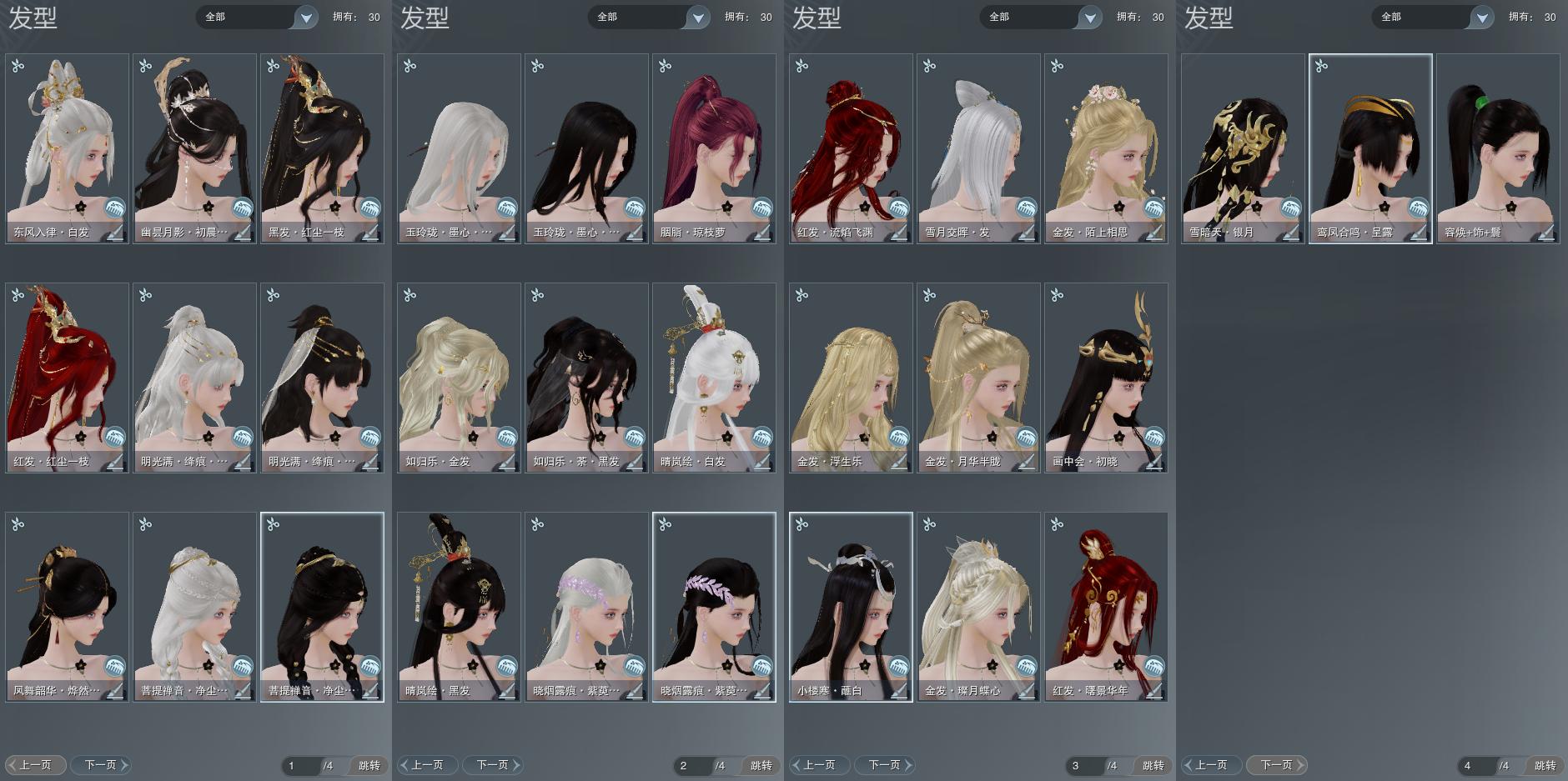 【发型】金发5个[狐金, 鸡金, 喵金, 考金, 如归金], 红发4个[九红, 十二红, 紫发, 猴红], 黑发11个, 白发7个, 盒子发型[紫盒黑发, 晴岚绘黑发, 雪月白发, 紫盒白发, 晴岚绘白发, 墨心黑发, 净尘黑发, 烨然黑发, 墨心白发, 净尘白发, 白明光黑发, 十二黑, 白明光白发, 金幽昙黑发, 除夕盒白发], 总页数4