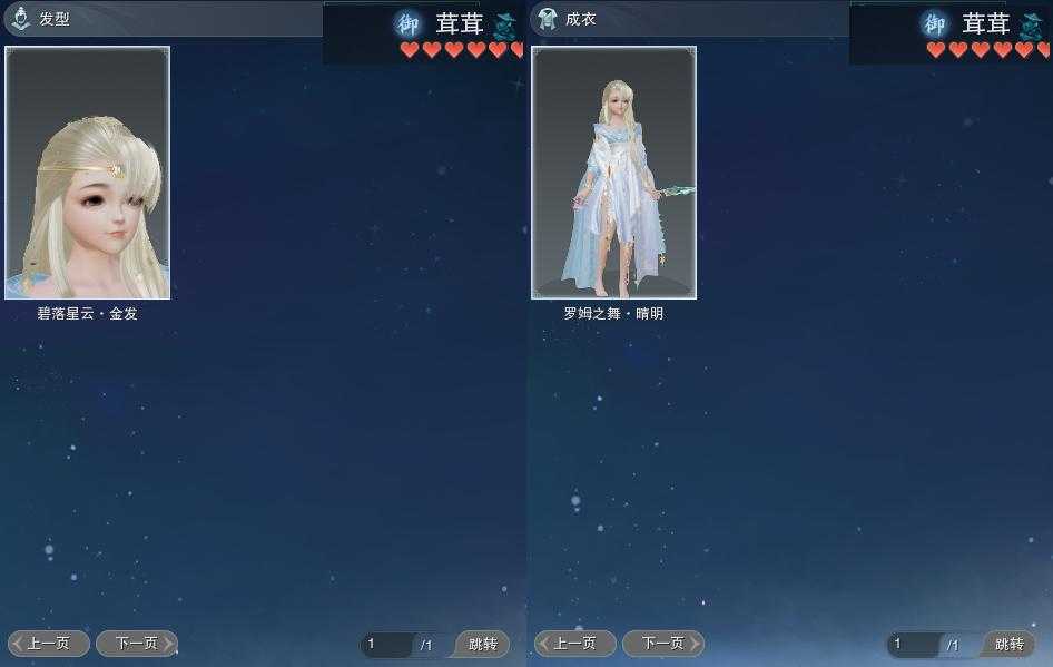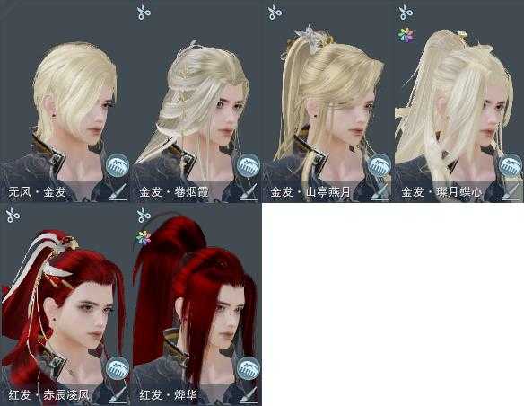 【发型】金发5个[狐金, 国金, 苏金, 角金, 无风金发], 红发2个[七红, 八红], 黑发12个, 白发17个, 盒子发型[一代蓝中秋白, 一代七夕白, 雪月白发, 绿中秋黑发, 绿中秋白发], 总页数4