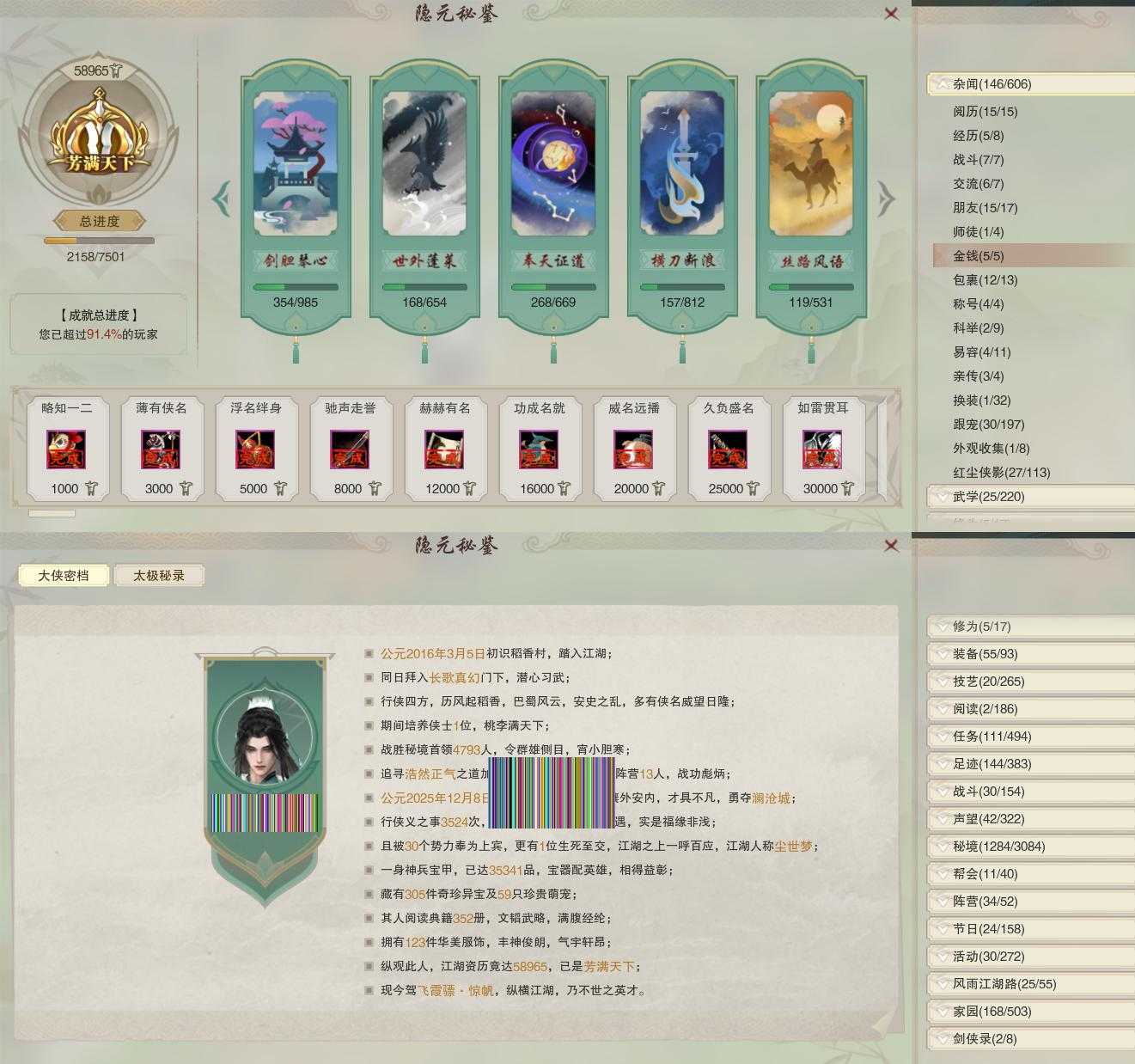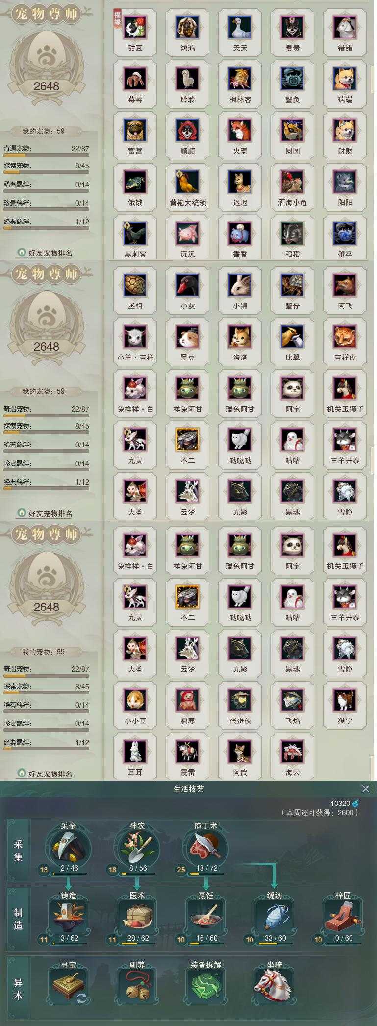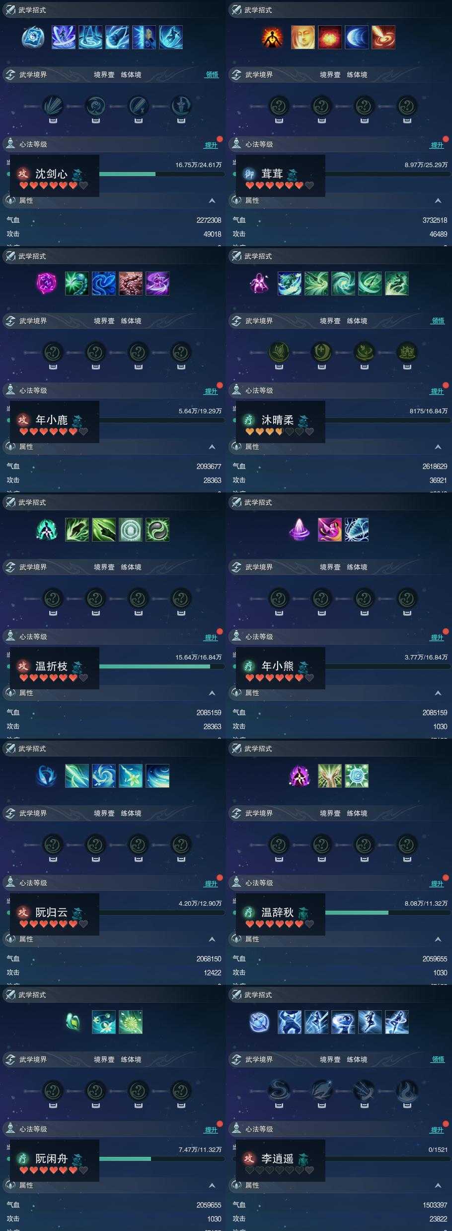 【同伴】沈剑心75级境界壹,茸茸74级境界壹,年小鹿72级境界壹,沐晴柔71级境界壹,温折枝71级境界壹,年小熊71级境界壹,阮归云69级境界壹,温辞秋68级境界壹,阮闲舟68级境界壹,李逍遥1级境界壹