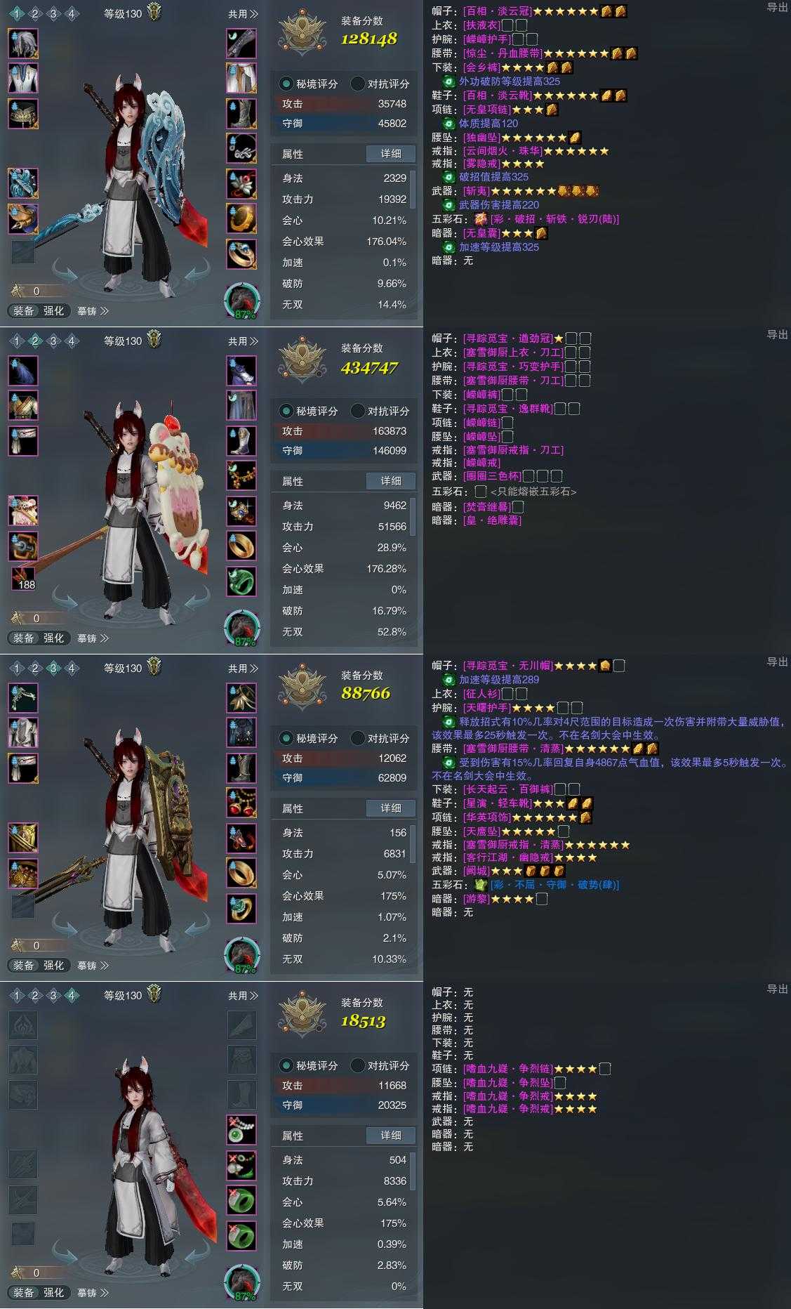 【装备】130级,装备一128148,分山劲PVE434747,装备三88766,装备四18513