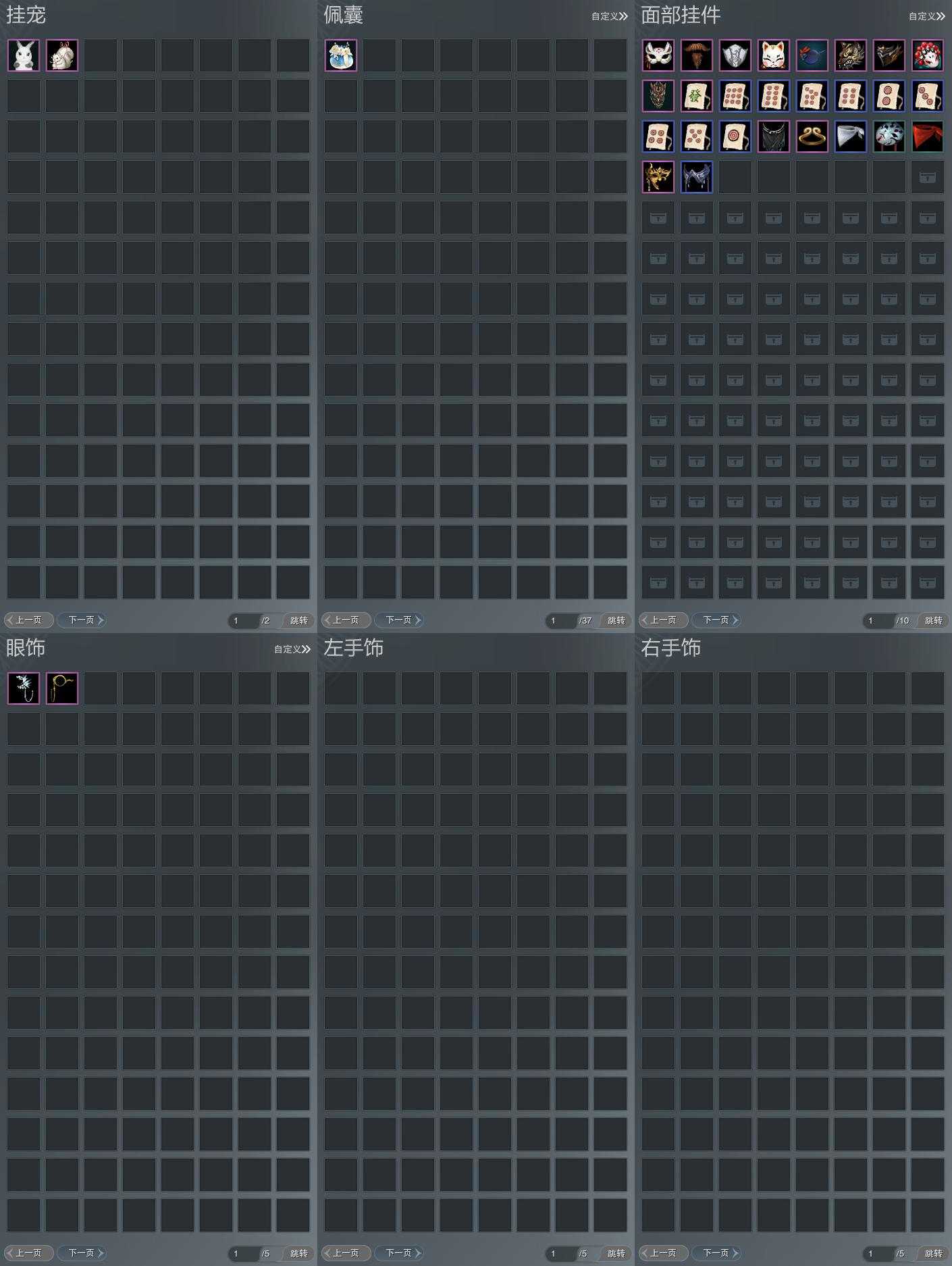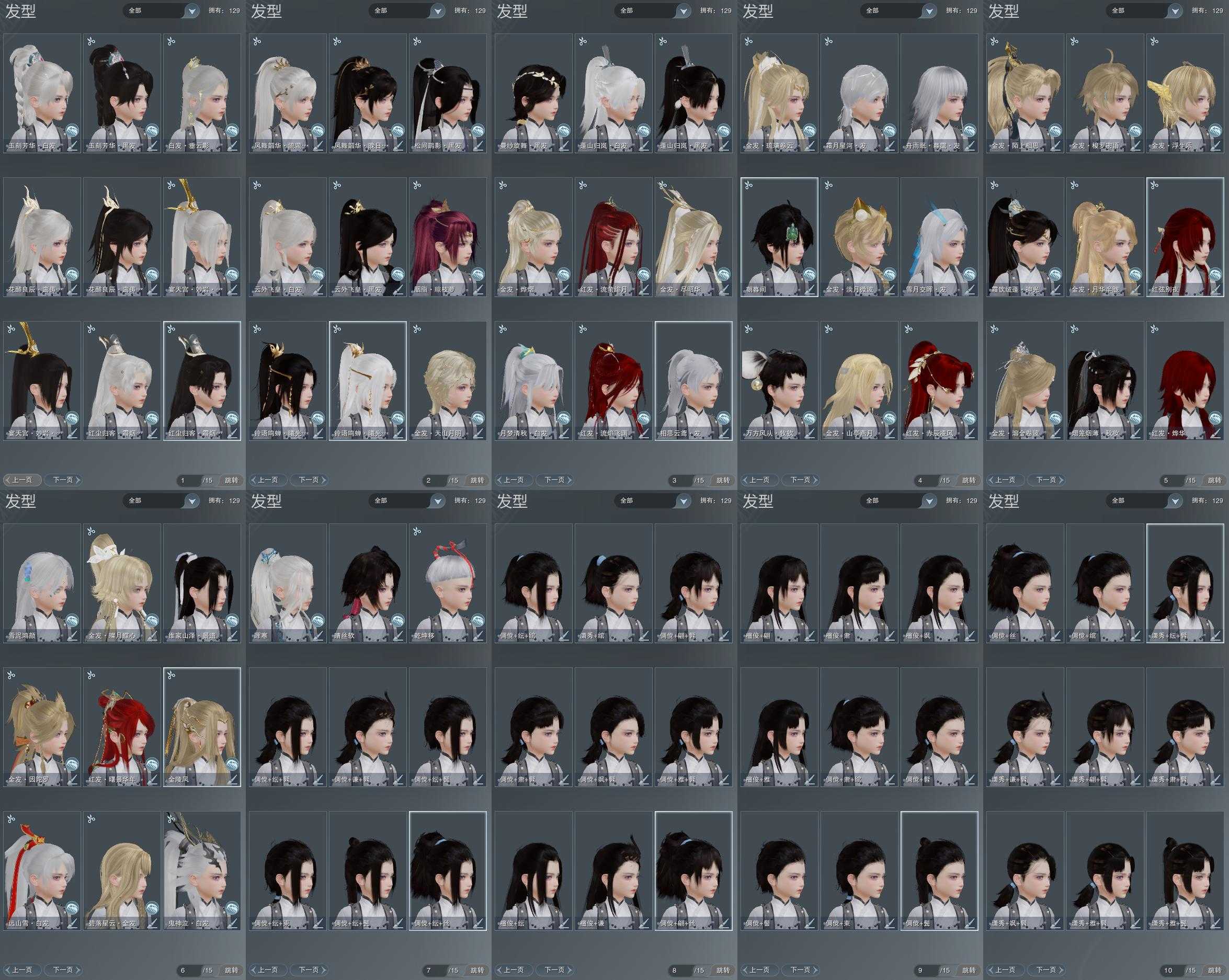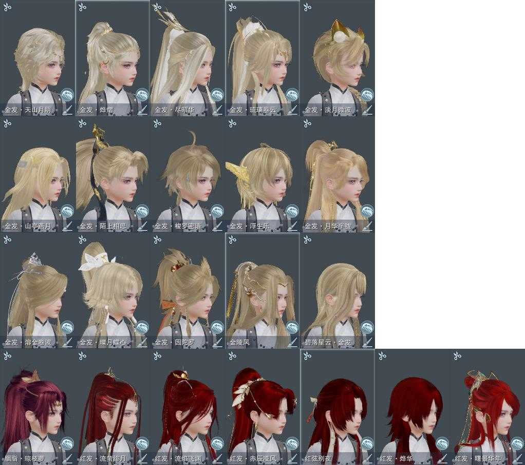 【发型】金发15个[一代金, 狐金, 猴金, 资历金, 中秋金, 鸡金, 蝶金, 喵金, 考金, 国金, 苏金, 倒闭金, 龙女金, 猪金, 丝路金], 红发7个[七红, 八红, 九红, 紫发, 猴红, 鸡红, 小资历红], 黑发16个, 白发17个, 盒子发型[二代花朝黑, 丝路黑, 一代七夕白, 一代花朝白白, 白端午白发, 三代中秋白, 三代七夕白, 雪月白发, 白楼兰黑发, 二代花朝白, 飞皇黑发, 同人黑发, 白楼兰白发, 飞皇白发, 晚日黑发, 白红尘黑发, 黑狮黑发, 流萤白发, 白红尘白发, 黑狮白发], 总页数10