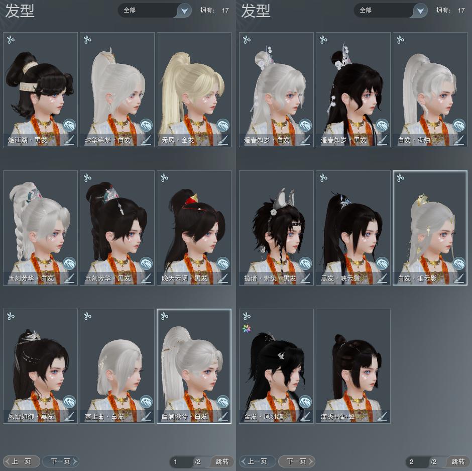 【发型】金发2个[凤金, 无风金发], 红发0个[], 黑发7个, 白发7个, 盒子发型[白懒猪黑发, 红梅盒黑发, 红梅盒白发, 弓盒黑发, 幽涧愀兮白发], 总页数2