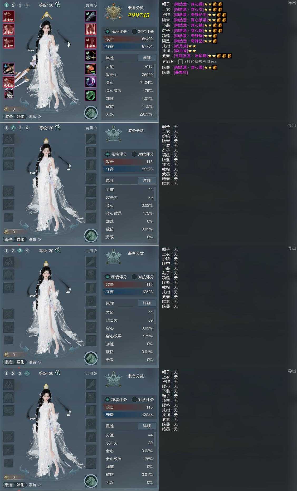 【装备】130级,装备一299745,装备二0,装备三0,装备四0