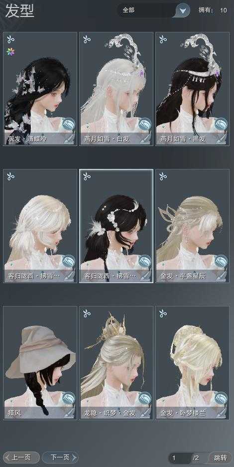 【发型】金发4个[女仆金, 精灵金, 白龙隐金发, 白陇西金发], 红发1个[蝶粉], 黑发3个, 白发1个, 盒子发型[白陇西黑发, 燕月盒黑发, 燕月盒白发], 总页数2