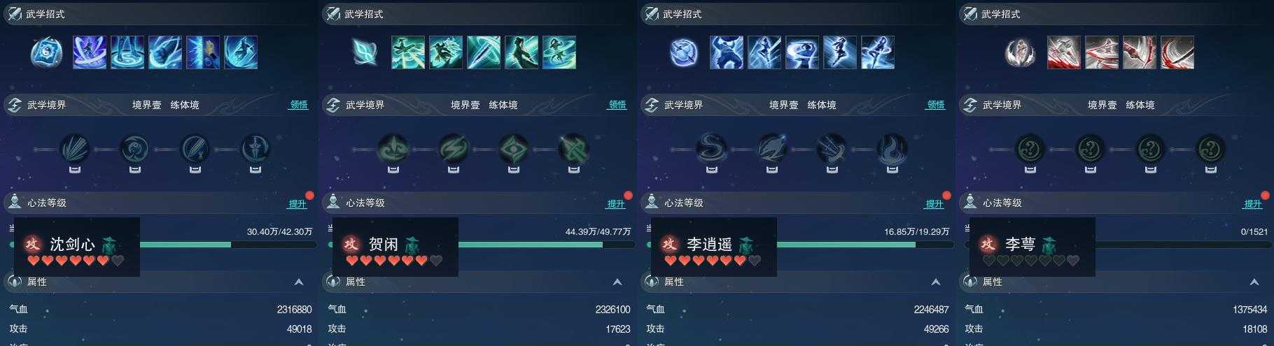 【同伴】沈剑心79级境界壹,贺闲志79级境界壹,李逍遥72级境界壹,李萼志1级境界壹