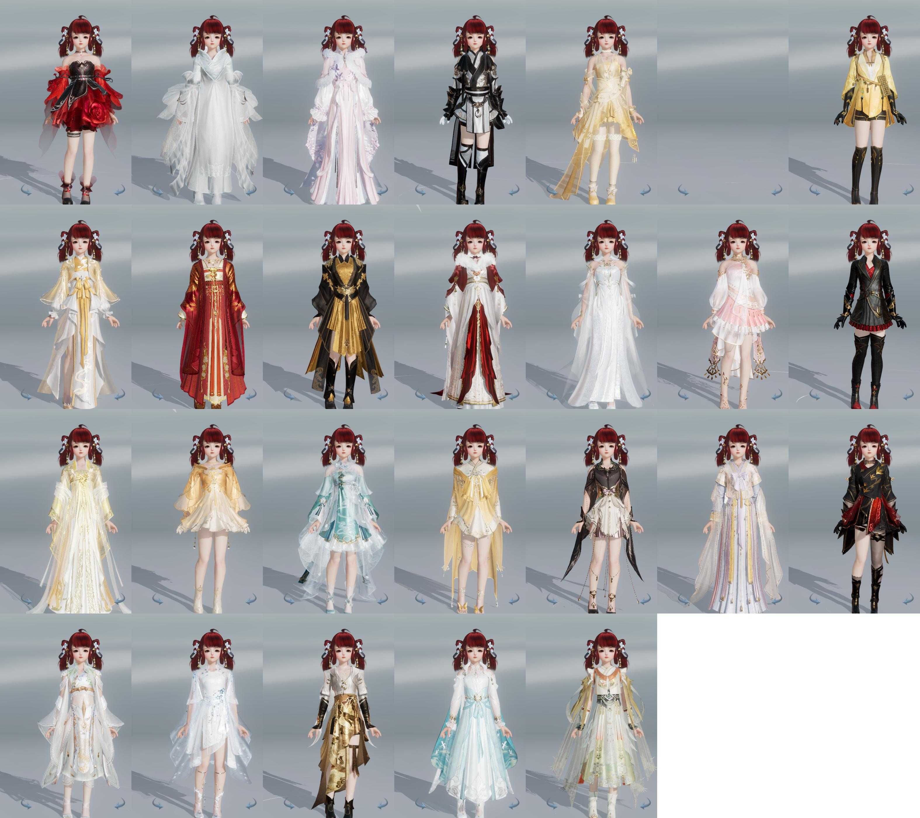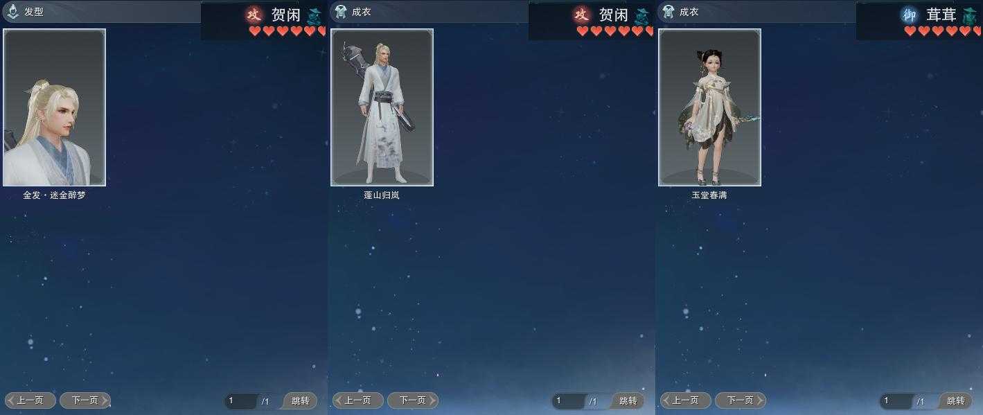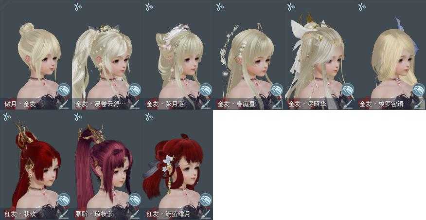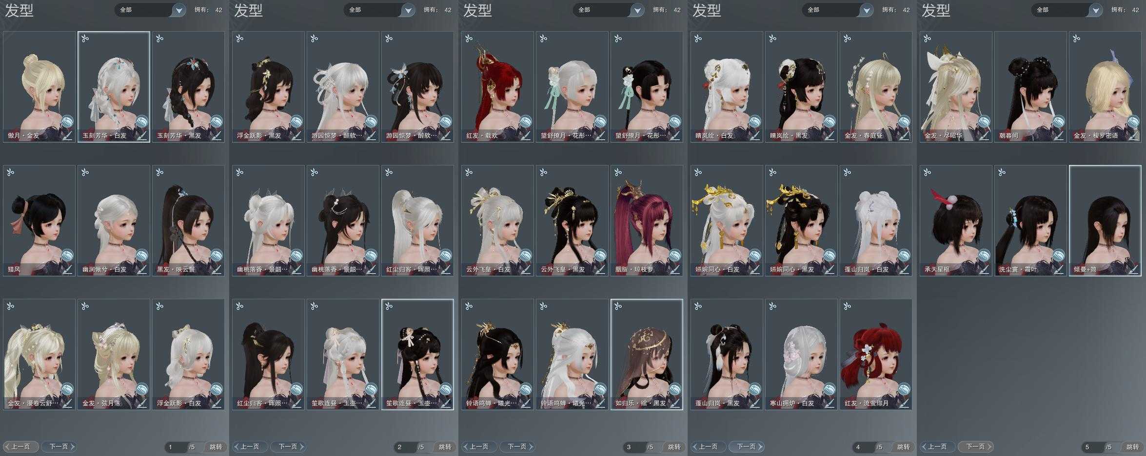 【发型】金发7个[资历金, 鼠金, 中秋金, 牛金, 巴卡金, 云金, 傲月金发], 红发3个[紫发, 牛红, 小资历红], 黑发17个, 白发14个, 盒子发型[二代花朝黑, 四代七夕黑发, 晴岚绘黑发, 棉袄白, 白楼兰黑发, 二代花朝白, 四代七夕白发, 飞皇黑发, 蓝中秋黑发, 晴岚绘白发, 白楼兰白发, 飞皇白发, 蓝中秋白发, 唐风玉壶黑发, 黑红尘黑发, 蓝游园黑发, 蓝幽香黑发, 小金龙黑发, 唐风玉壶白发, 黑红尘白发, 蓝游园白发, 蓝幽香白发, 小金龙白发, 幽涧愀兮白发], 总页数5