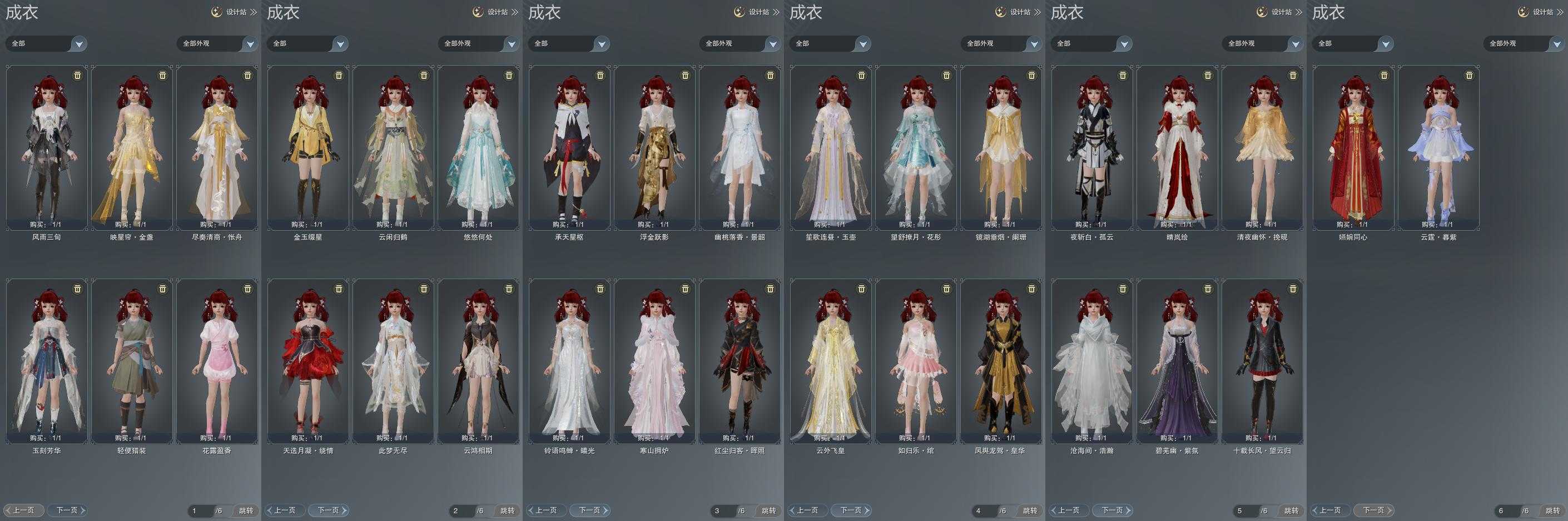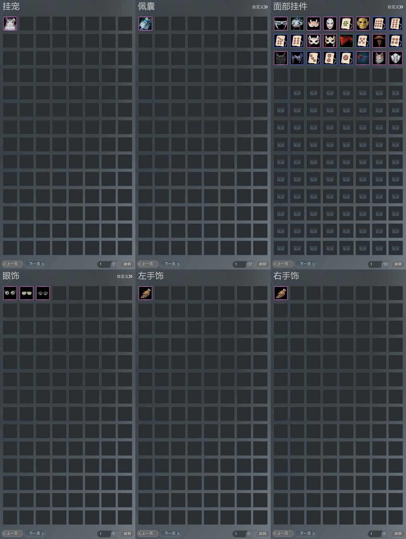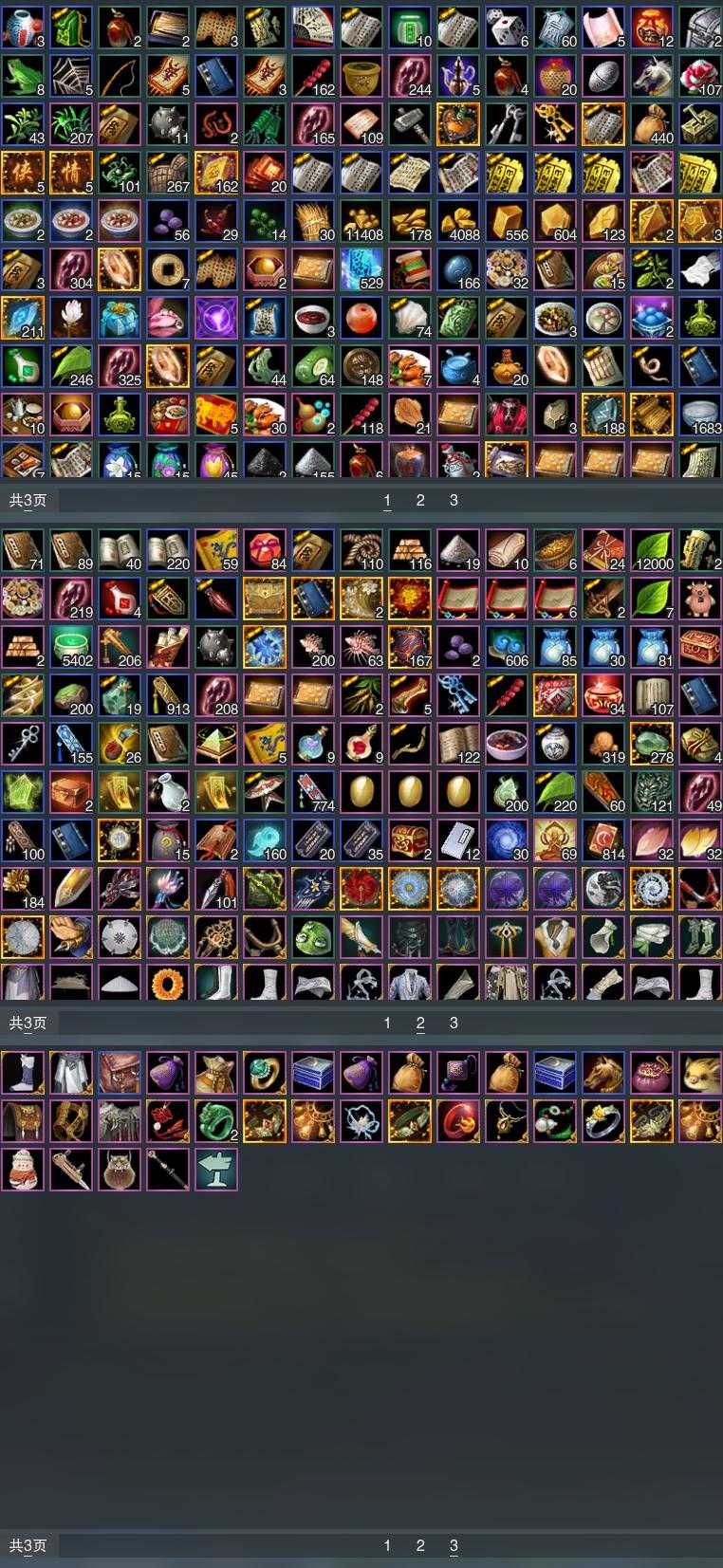 【发型】金发7个[资历金, 鼠金, 中秋金, 牛金, 巴卡金, 云金, 傲月金发], 红发3个[紫发, 牛红, 小资历红], 黑发17个, 白发14个, 盒子发型[二代花朝黑, 四代七夕黑发, 晴岚绘黑发, 棉袄白, 白楼兰黑发, 二代花朝白, 四代七夕白发, 飞皇黑发, 蓝中秋黑发, 晴岚绘白发, 白楼兰白发, 飞皇白发, 蓝中秋白发, 唐风玉壶黑发, 黑红尘黑发, 蓝游园黑发, 蓝幽香黑发, 小金龙黑发, 唐风玉壶白发, 黑红尘白发, 蓝游园白发, 蓝幽香白发, 小金龙白发, 幽涧愀兮白发], 总页数5