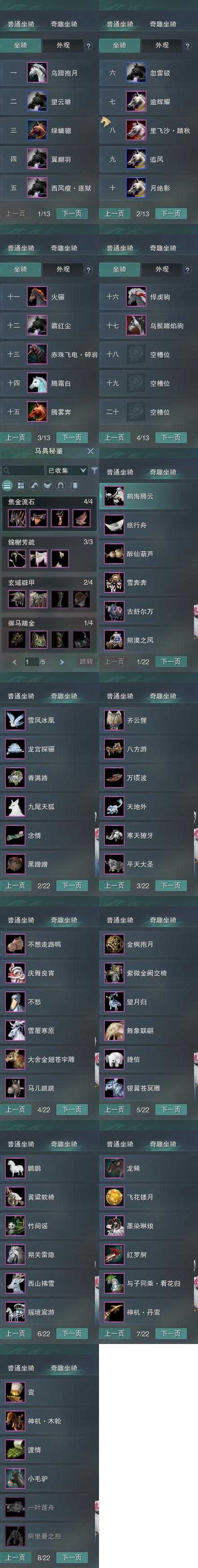 【坐骑】17个[西风瘦逐狱, 赤珠碎岩, 乌蹄抱月, 里飞沙踏秋, 霸红尘, 乌鬃踏焰驹]