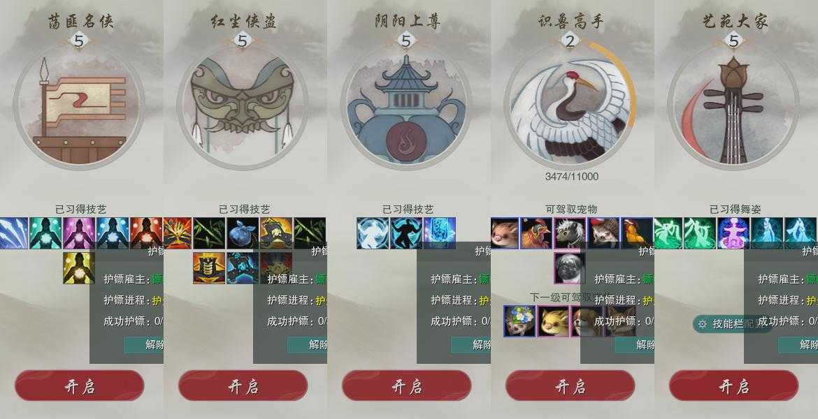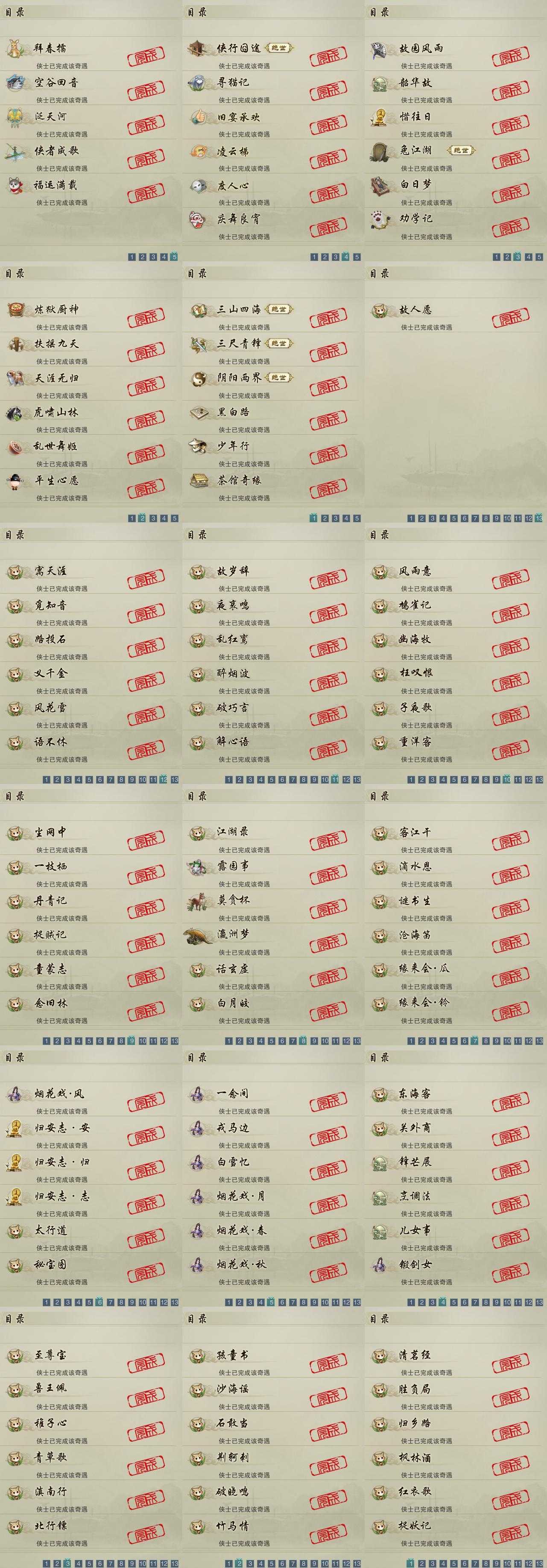 【奇遇】29个[白日梦, 天涯无归, 三山四海, 劝学记, 阴阳两界, 兔江湖, 平生心愿, 黑白路, 惜往日, 乱世舞姬, 韶华故, 虎啸山林, 少年行, 故园风雨, 扶摇九天, 三尺青锋, 侠行囧途, 寻猫记, 茶馆奇缘, 庆舞良宵, 凌云梯, 炼狱厨神, 度人心, 空谷回音, 旧宴承欢, 泛天河, 侠者成歌, 拜春擂, 福运满载]