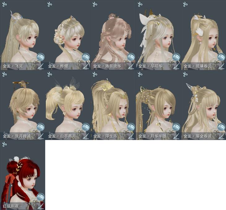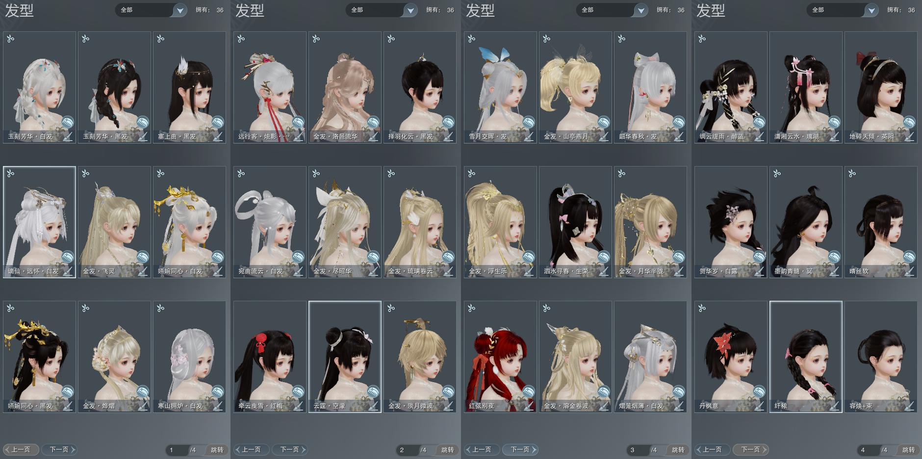 【发型】金发10个[中秋金, 鸡金, 蝶金, 喵金, 国金, 倒闭金, 龙女金, 玫瑰金, 猪金, 飒金], 红发1个[鸡红], 黑发15个, 白发8个, 盒子发型[二代七夕白, 四代七夕黑发, 二代重阳白, 雪月白发, 棉袄白, 四代七夕白发, 黑谪仙白发], 总页数4