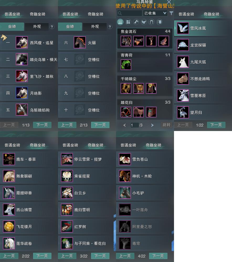 【坐骑】6个[踏炎横天, 西风瘦追星, 里飞沙踏秋, 乌鬃踏焰驹]