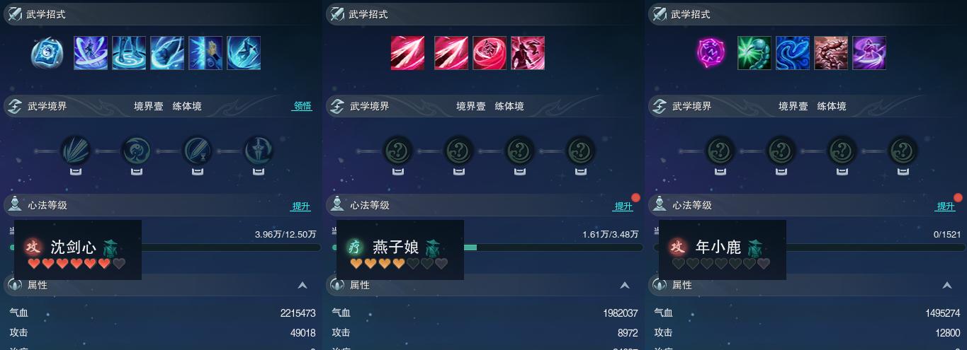 【同伴】沈剑心70级境界壹,燕子娘59级境界壹,年小鹿1级境界壹