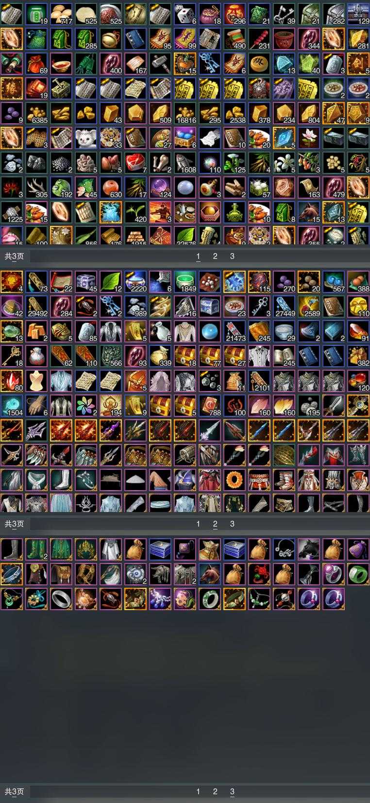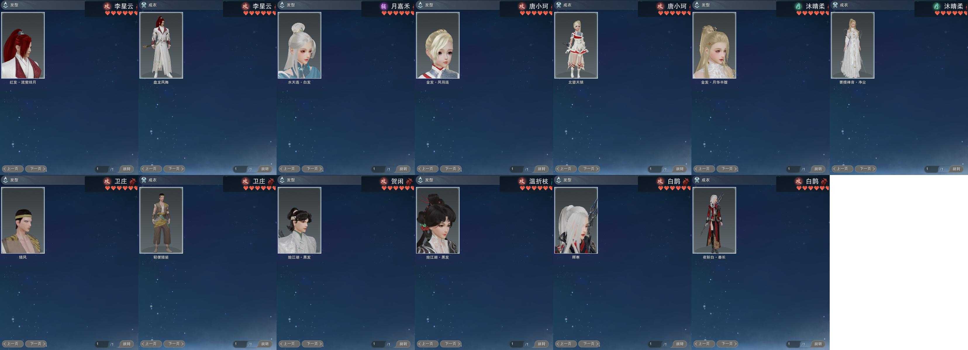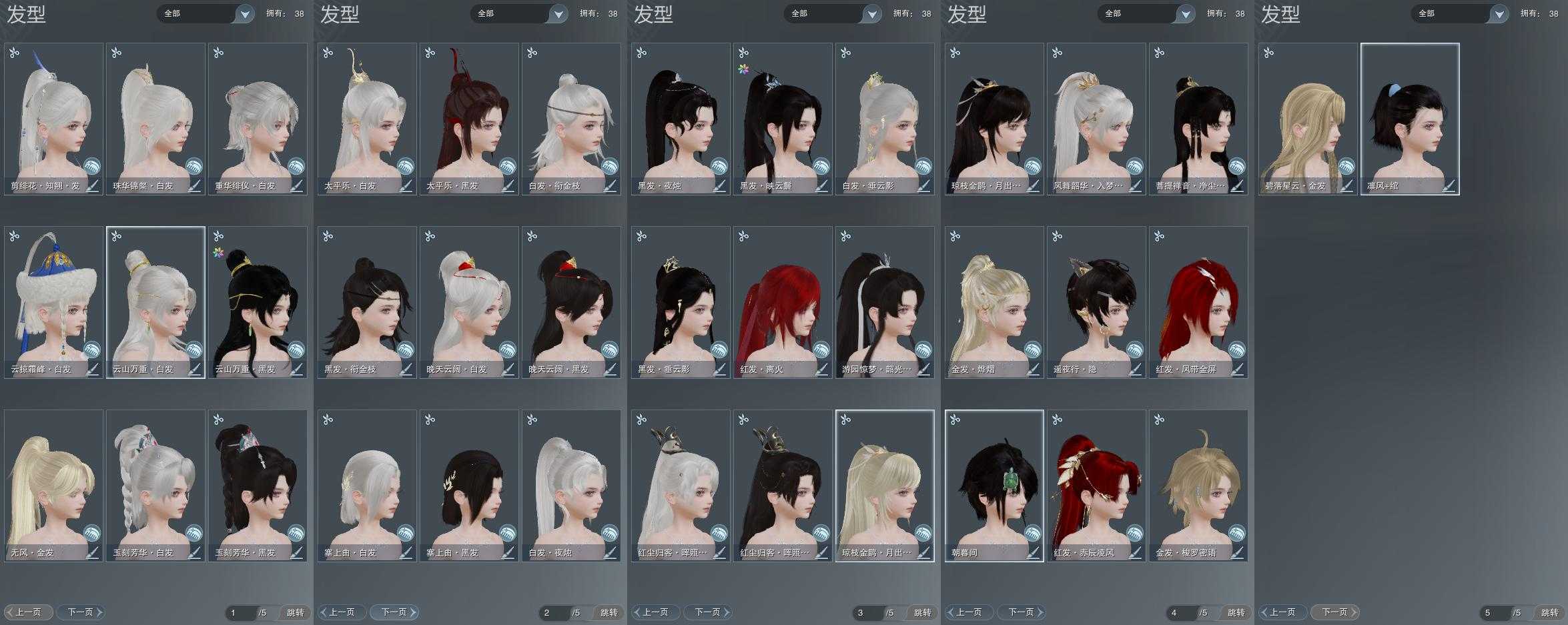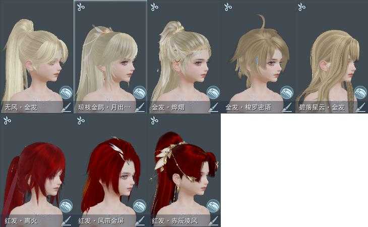 【发型】金发7个[资历金, 鸡金, 苏金, 猪金, 凤金, 无风金发, 澄琼枝金发], 红发4个[八红, 狗红, 小资历红, 大资历红], 黑发17个, 白发16个, 盒子发型[净尘黑发, 澄琼枝黑发, 黑红尘黑发, 入梦白发, 白游园黑发, 黑红尘白发, 云掠霜峰白发], 总页数5