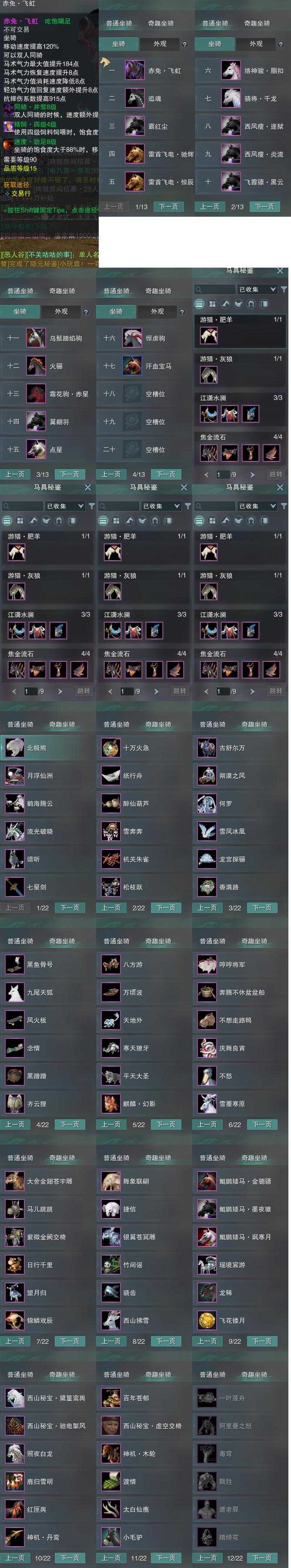 【坐骑】17个[西风瘦炎流, 西风瘦逐狱, 飞霞骠黑云, 劲足赤兔飞虹, 霜花驹赤星, 络神骏胭扣, 骁将千龙, 霸红尘, 雷首飞电惊辰, 雷首飞电驰辉, 乌鬃踏焰驹]