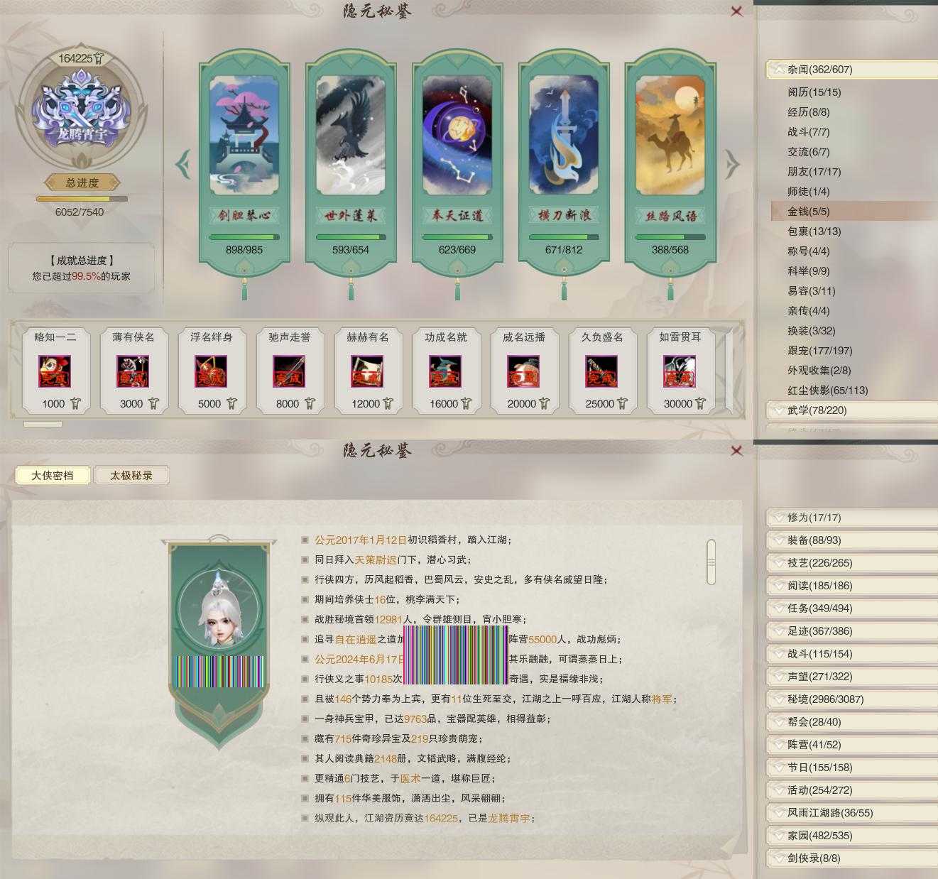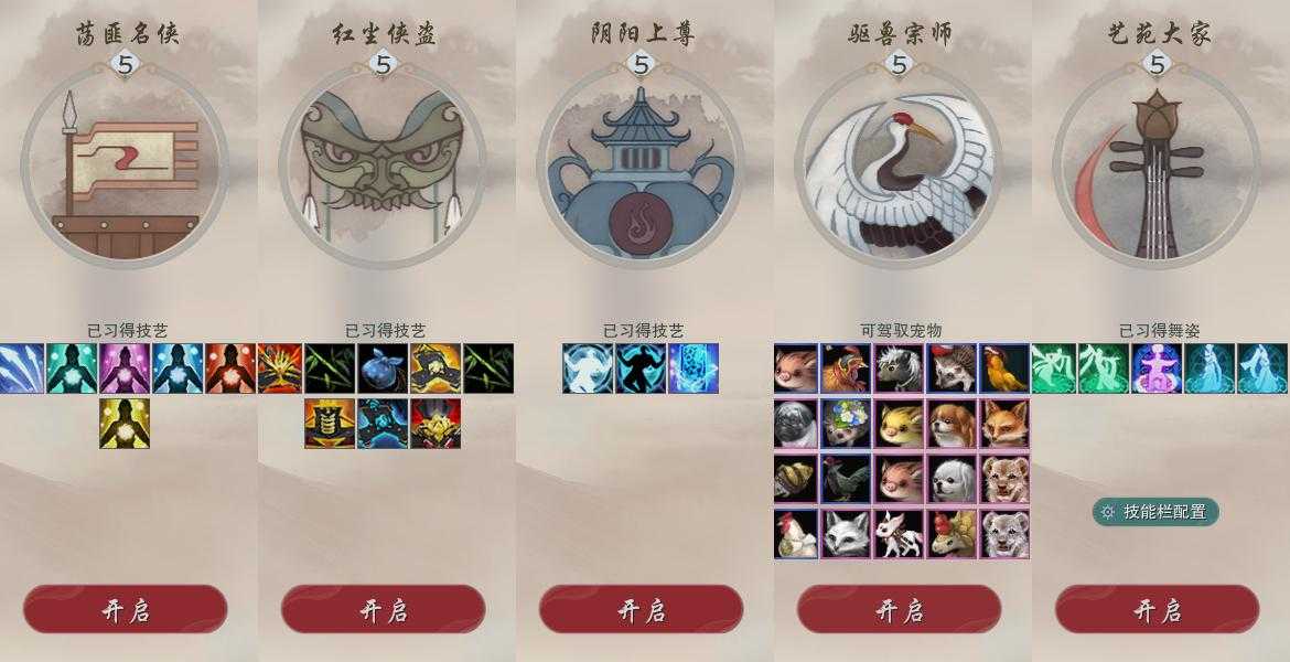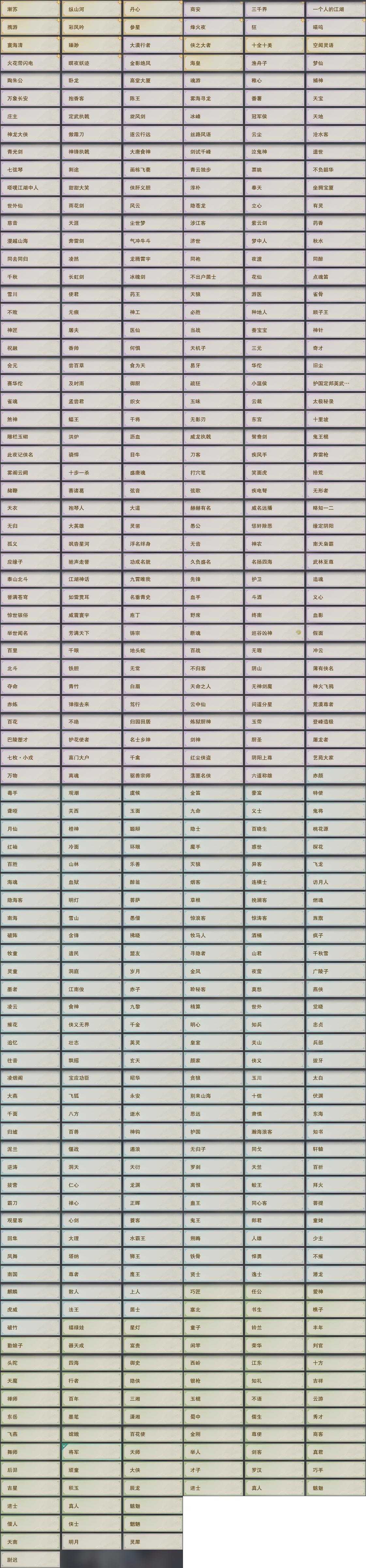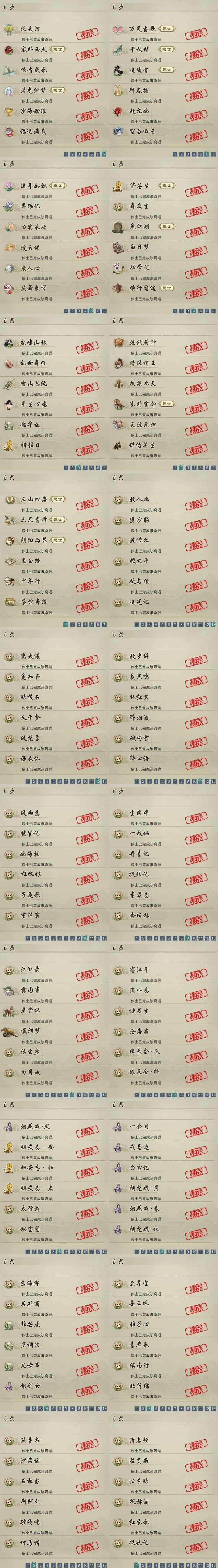 【奇遇】42个[白日梦, 天涯无归, 三山四海, 劝学记, 雪山恩仇, 阴阳两界, 兔江湖, 平生心愿, 黑白路, 乱世舞姬, 惜往日, 塞外宝驹, 虎啸山林, 韶华故, 济苍生, 护佑苍生, 少年行, 扶摇九天, 三尺青锋, 流年如虹, 舞众生, 清风捕王, 寻猫记, 侠行囧途, 茶馆奇缘, 万灵当歌, 庆舞良宵, 千秋铸, 凌云梯, 炼狱厨神]