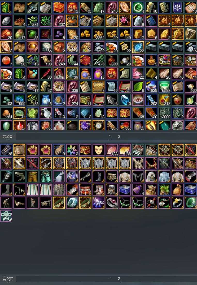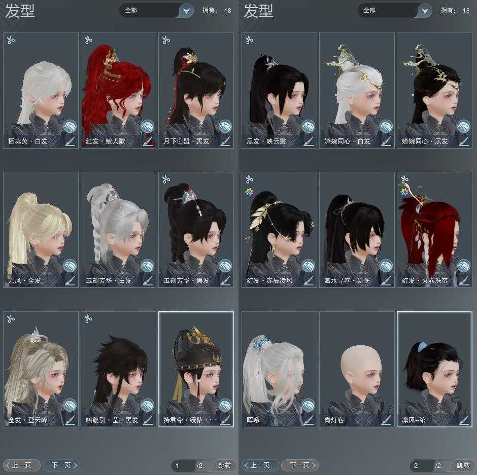 【发型】金发2个[三代金, 无风金发], 红发3个[六红, 八红, 十五红], 黑发8个, 白发4个, 盒子发型[四代七夕黑发, 四代七夕白发, 紫持君盒黑发, 白幽馥黑发, 九七黑发], 总页数2