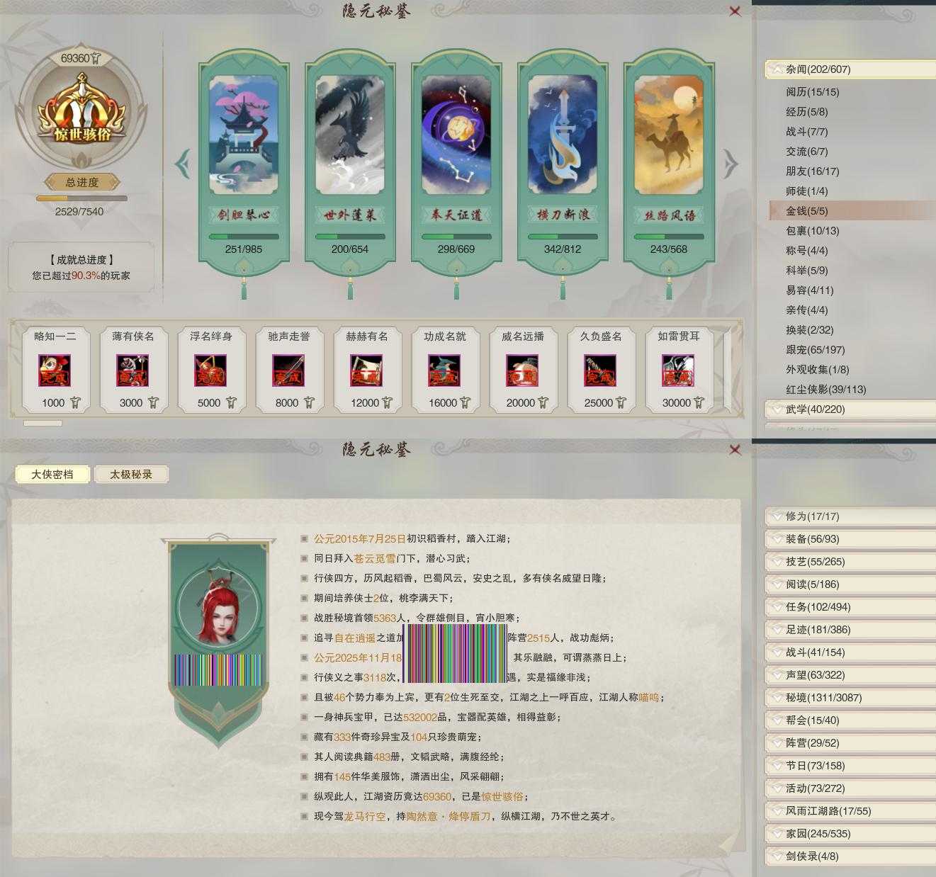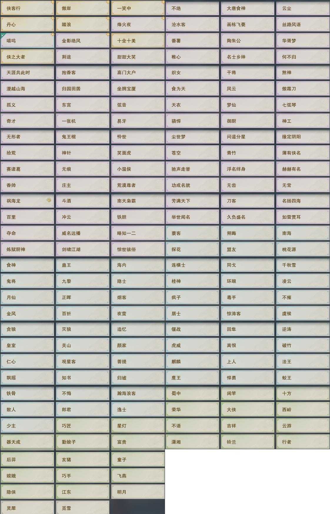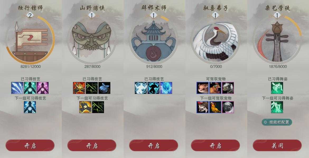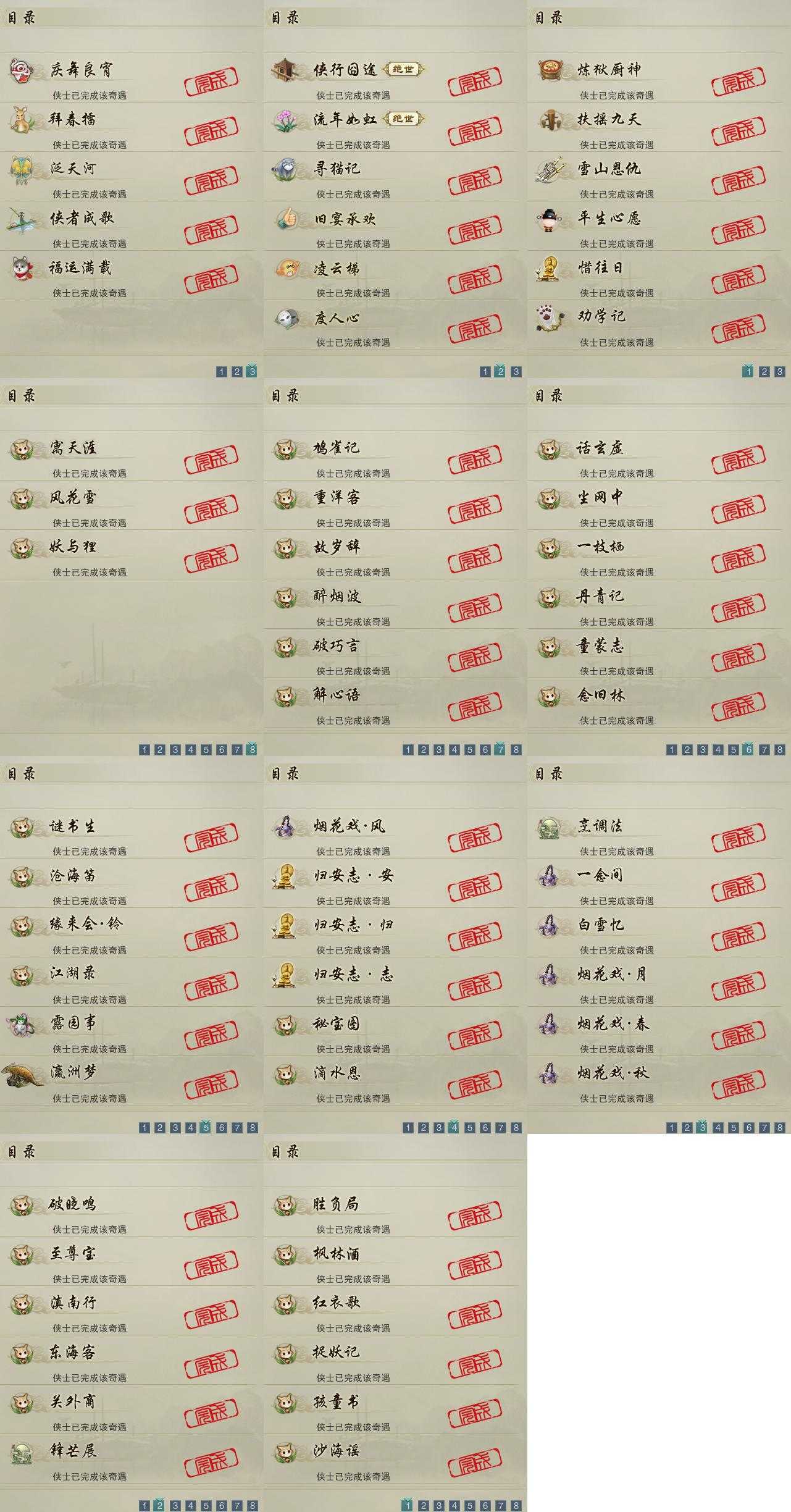 【奇遇】17个[雪山恩仇, 劝学记, 平生心愿, 惜往日, 扶摇九天, 流年如虹, 侠行囧途, 寻猫记, 庆舞良宵, 凌云梯, 炼狱厨神, 度人心, 旧宴承欢, 泛天河, 侠者成歌, 拜春擂, 福运满载]