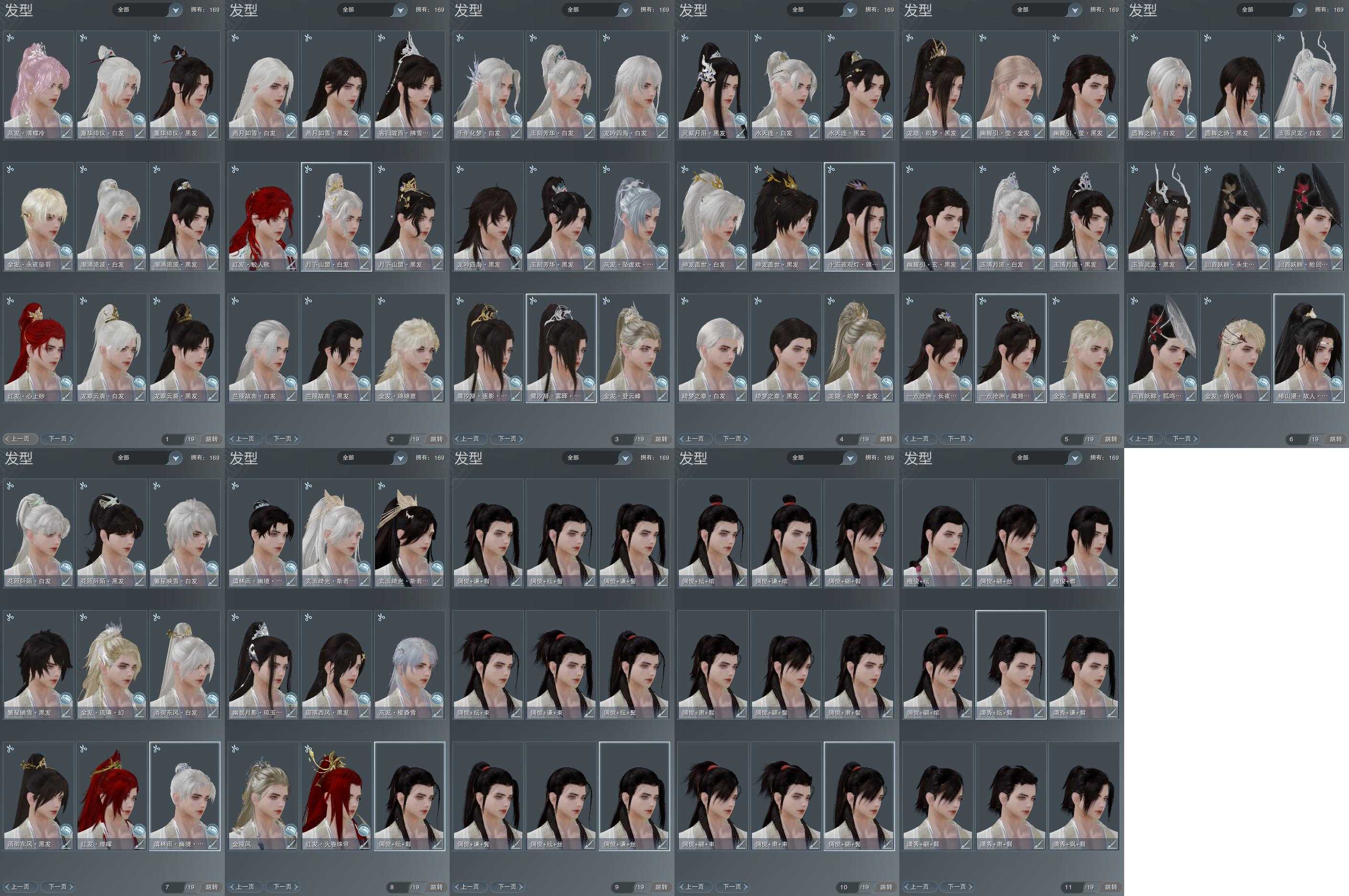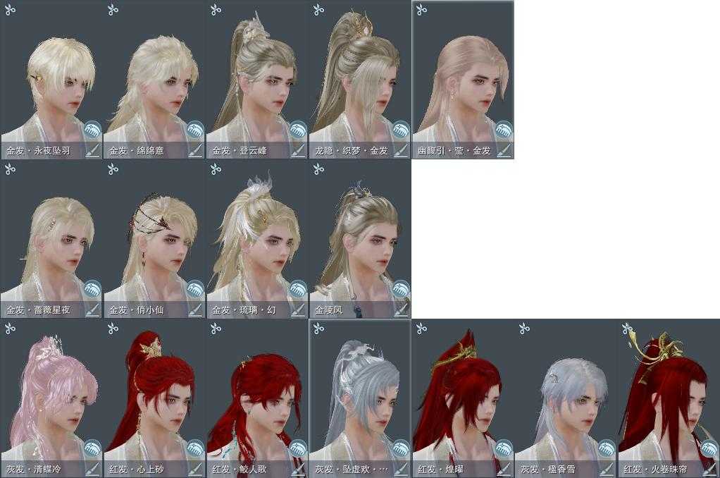 【发型】金发10个[一代金, 海金, 刺金, 蔷薇金, 三代金, 咩金, 无风金发, 永夜金, 白幽馥金发, 白龙隐金发], 红发8个[六红, 蝶粉, 兔红, 十五红, 蛇红, 二代灰, 一代灰, 三代灰银], 黑发38个, 白发24个, 盒子发型[白幽昙黑发, 白玄玉黑发, 镖盒黑发, 黑傣族黑发, 白幽昙白发, 卿酒盒黑发, 白雪人白发, 镖盒白发, 不良人盒黑发, 黑傣族白发, 黑椿山黑发, 踏青黑发, 红白妖眸盒黑发, 红黑妖眸盒黑发, 卿酒盒白发, 棕黑妖眸盒黑发, 灵龙盒黑发, 不良人盒白发, 圆舞盒黑发, 蓝沧洲盒黑发, 踏青白发, 黑沧洲盒黑发, 灵龙白发, 八七盒黑发, 圆舞盒白发, 白幽馥黑发, 黑幽馥黑发, 白龙隐黑发, 八七盒白发, 婚纱盒黑发, 紫观灯盒黑发, 熊猫黑发, 茄盒黑发, 白鹭黑发, 婚纱盒白发, 黑鹭黑发, 龙吟盒黑发, 梦盒黑发, 兰陵盒黑发, 熊猫白发, 茄盒白发, 九七黑发, 龙吟盒白发, 梦盒白发, 兰陵盒白发, 绿千山黑发, 九七白发, 白陇西黑发, 燕月盒黑发, 绿千山白发, 墨龙盒黑发, 燕月盒白发, 墨龙盒白发, 潮涌盒黑发, 潮涌盒白发], 总页数11