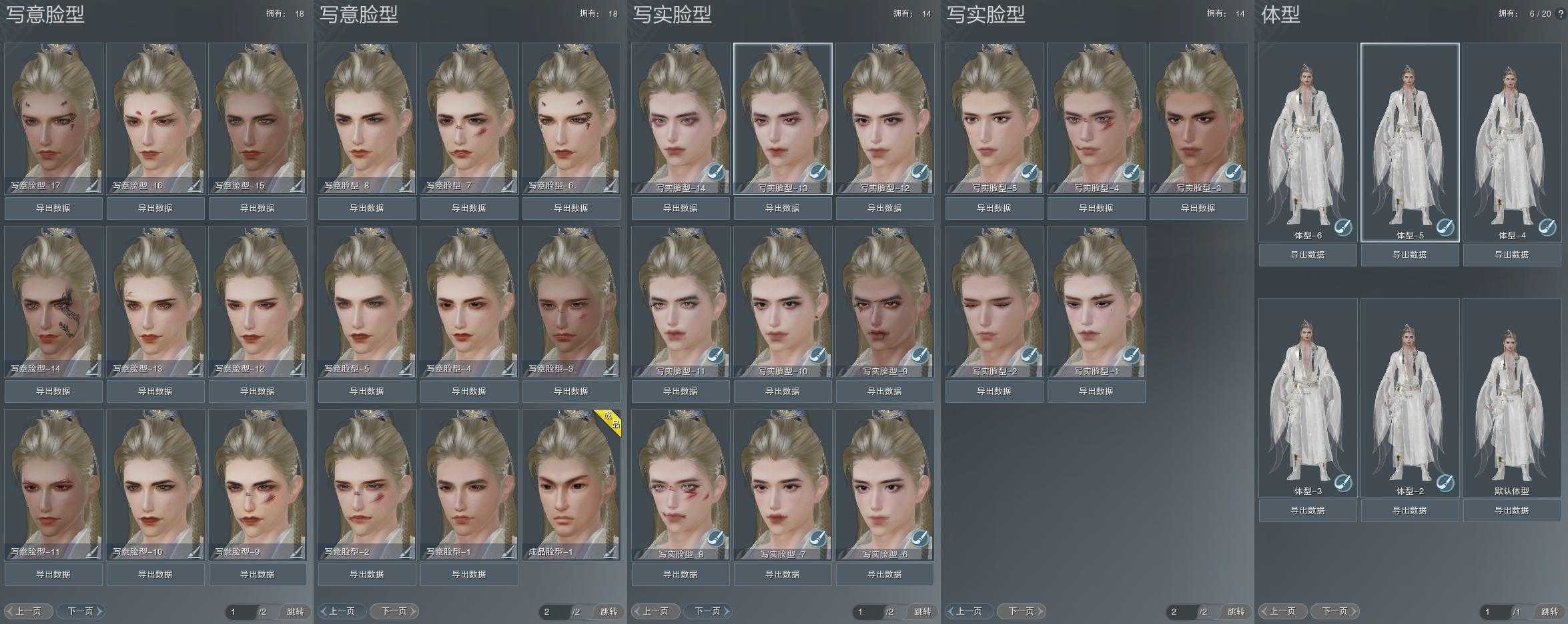 【捏脸】写意脸型18个,写实脸型14个,体型6个