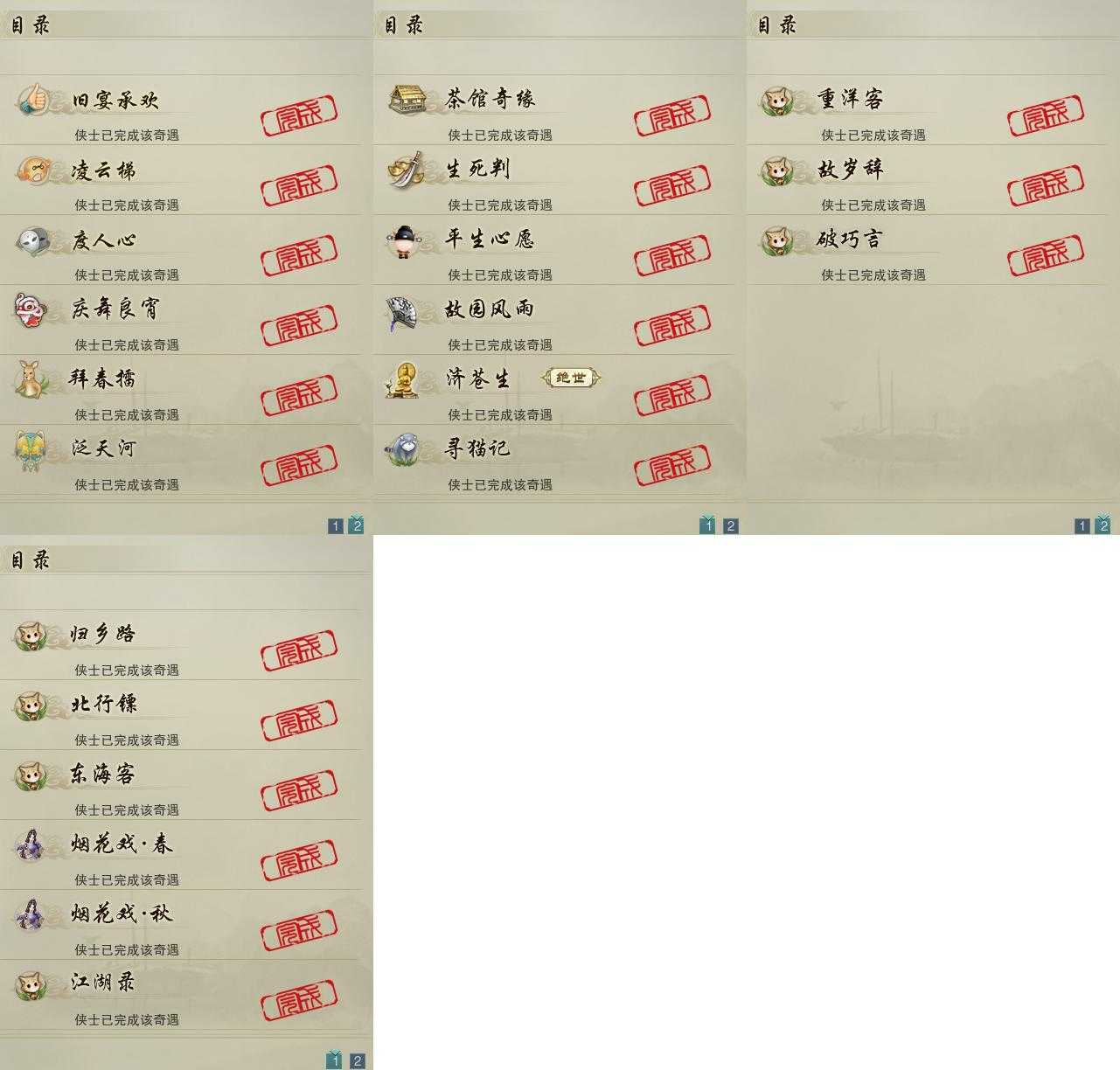 【奇遇】12个[平生心愿, 济苍生, 故园风雨, 茶馆奇缘, 寻猫记, 庆舞良宵, 生死判, 凌云梯, 度人心, 旧宴承欢, 泛天河, 拜春擂]