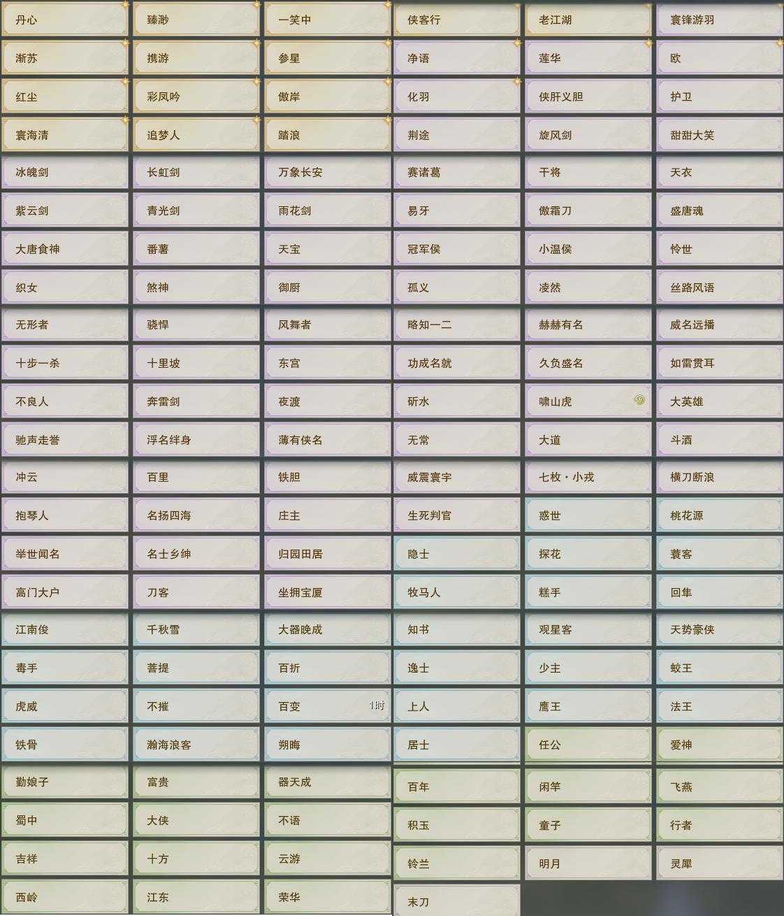 盒子:[刀宗盒, 龙盒, 龙吟盒, 白雪人盒, 镖盒, 兔盒, 卿酒盒, 苍二盒, 不良人盒, 踏青盒, 红白妖龙盒(标), 红黑妖龙盒(标), 棕黑妖龙盒(标), 莲华盒, 灵龙盒, 圆舞盒, 蓝沧州盒(标), 黑沧州盒(标), 白幽昙(标), 策二盒, 黑傣族盒(豪), 八七盒, 黑椿山盒(标), 白龙隐(豪), 婚纱盒, 熊猫盒, 紫观灯盒(标), 茄盒, 梦盒, 九七盒, 兰陵盒, 燕月盒, 白鹭盒(标), 墨龙盒, 黑鹭盒(标), 潮涌盒, 绿千山(豪), 白陇西(标)]