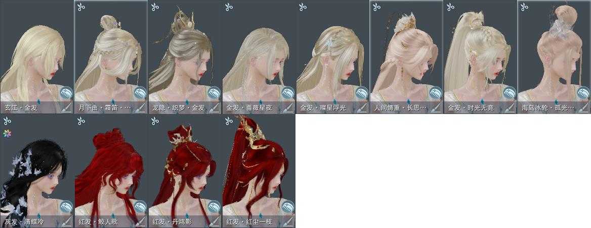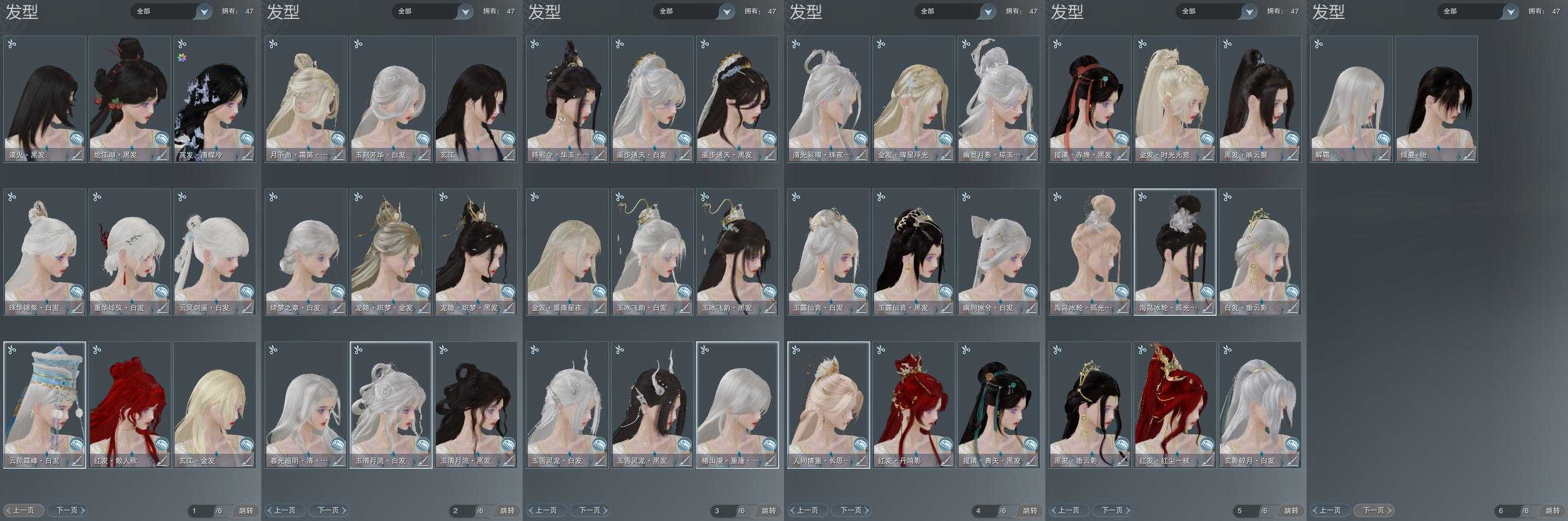 【发型】金发8个[时光金, 雪金, 蔷薇金, 玄江金发, 白海岛金发, 绿人间金发, 白龙隐金发, 紫月下金发], 红发4个[十二红, 蝶粉, 虎红, 十五红], 黑发17个, 白发19个, 盒子发型[白海岛黑发, 绿懒猪黑发, 红懒猪黑发, 山海黑发, 山海白发, 幽涧愀兮白发, 白幽昙白发, 灵龙盒黑发, 粉钻石盒白发, 蓝兔盒黑发, 蓝椿山白发, 西游盒黑发, 白持君盒黑发, 灵龙白发, 蓝兔盒白发, 八七盒黑发, 西游盒白发, 白龙隐黑发, 八七盒白发, 白八中白发, 婚纱盒白发, 云掠霜峰白发, 仙剑白发], 总页数6