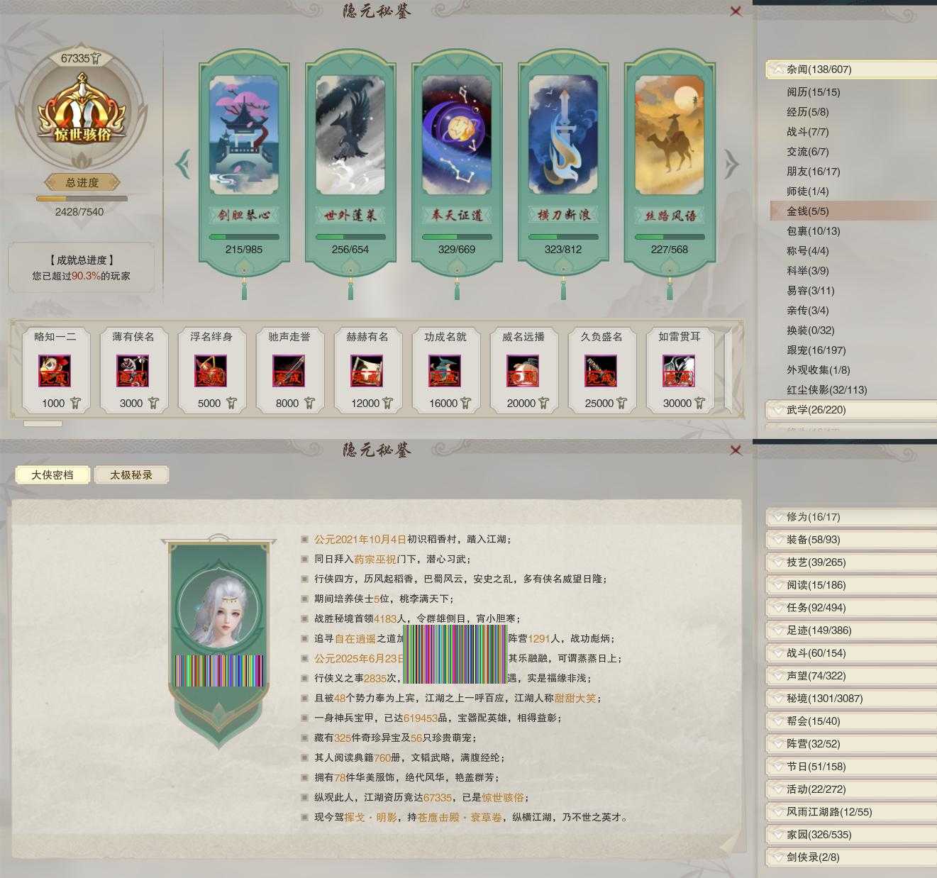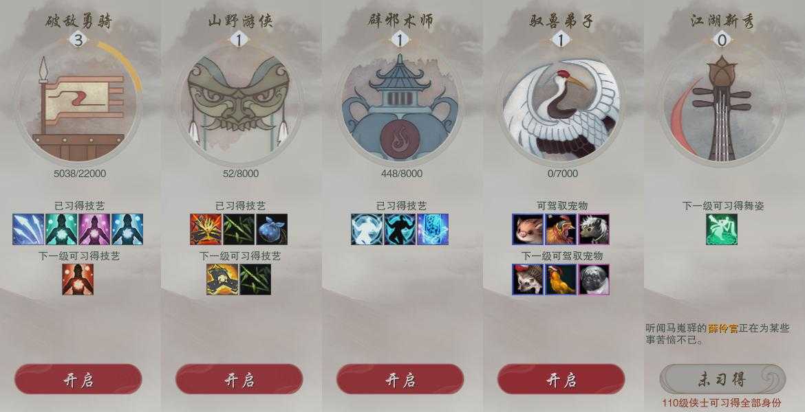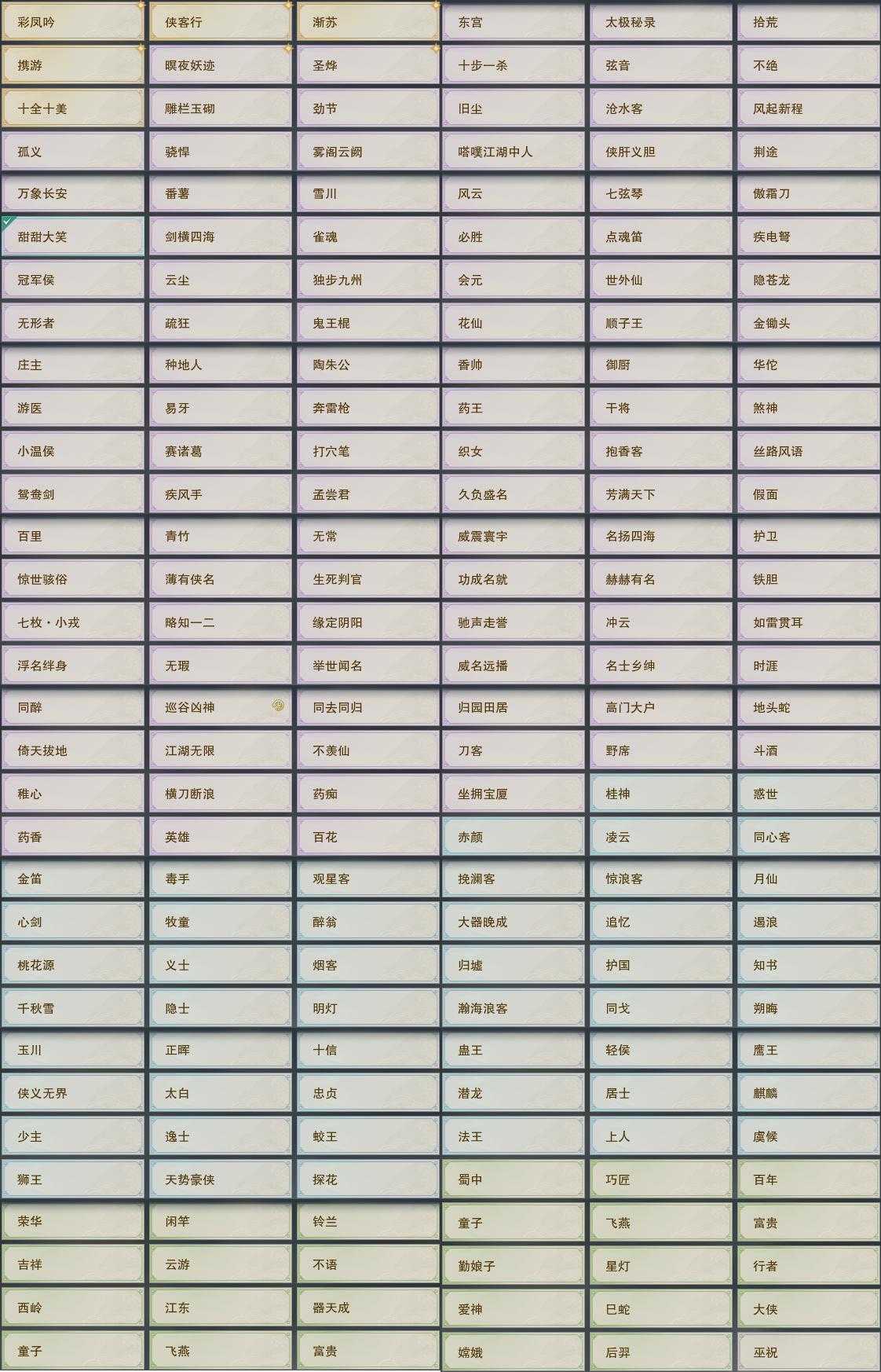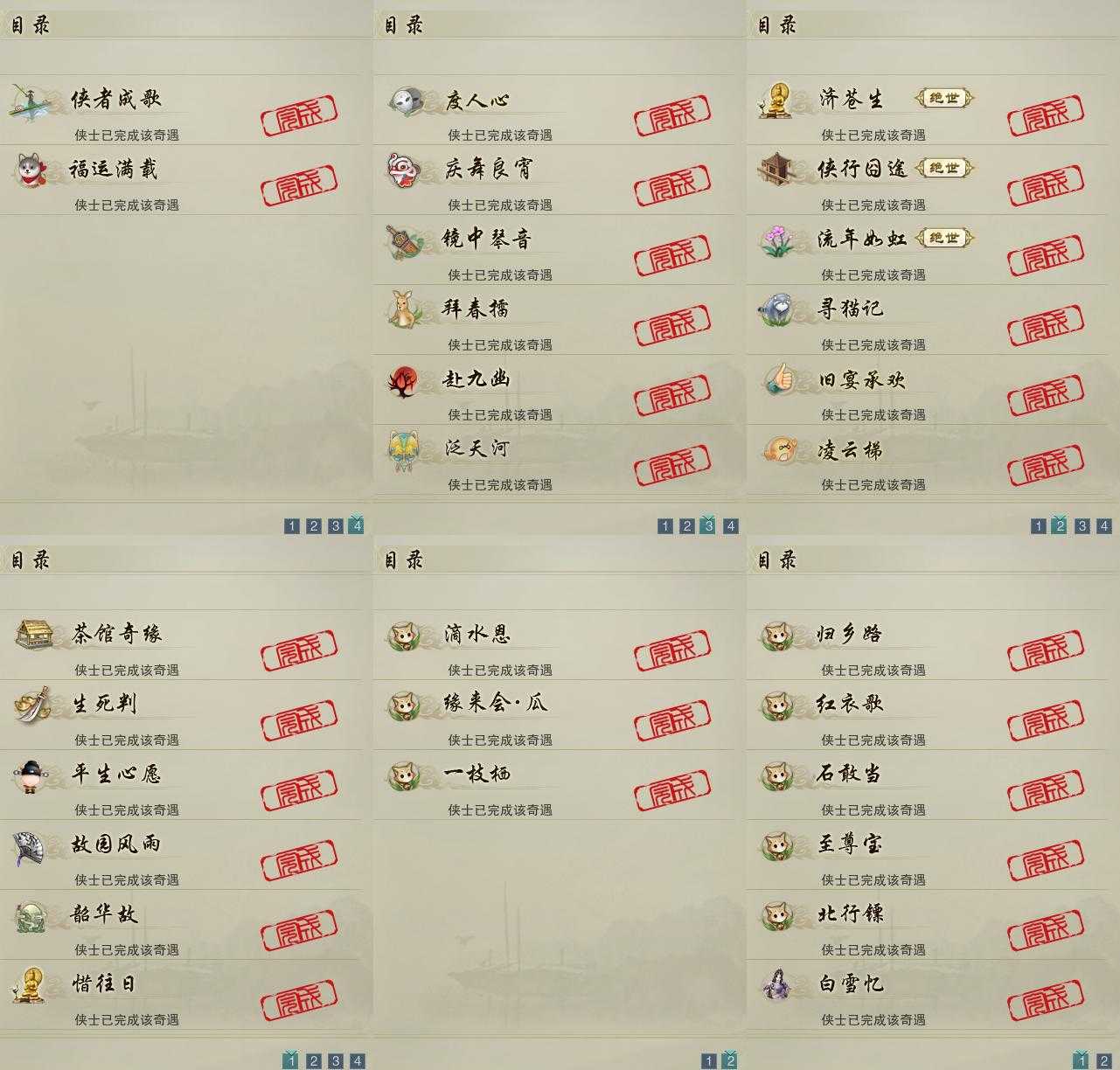 【奇遇】20个[平生心愿, 惜往日, 韶华故, 济苍生, 故园风雨, 流年如虹, 侠行囧途, 寻猫记, 茶馆奇缘, 庆舞良宵, 生死判, 凌云梯, 度人心, 赴九幽, 旧宴承欢, 镜中琴音, 泛天河, 侠者成歌, 拜春擂, 福运满载]