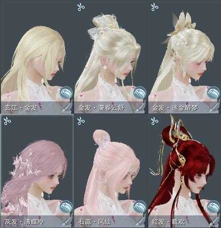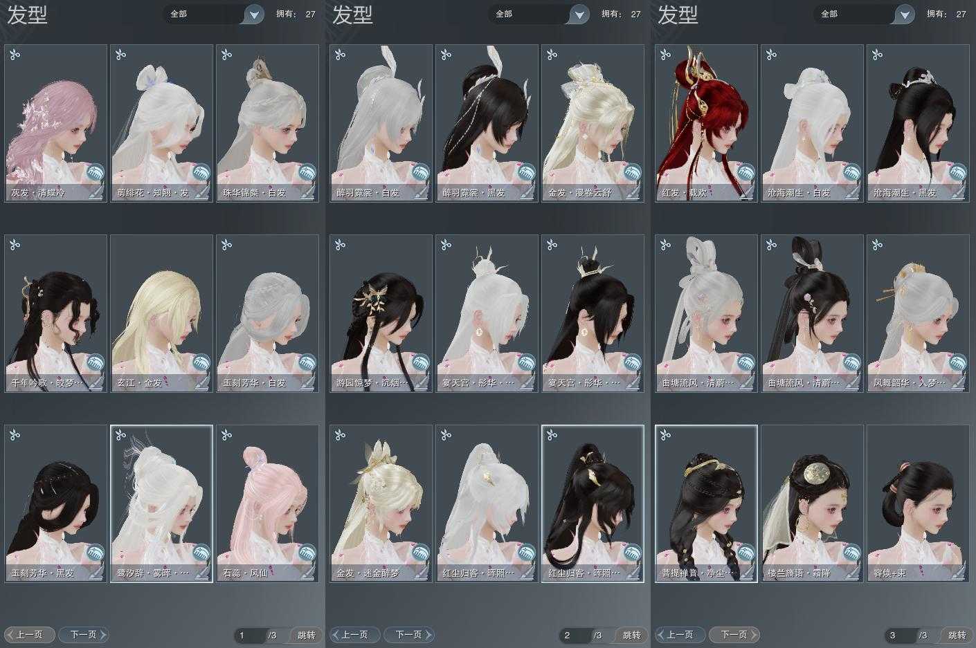 【发型】金发3个[牛金, 云金, 玄江金发], 红发3个[凤仙粉, 蝶粉, 牛红], 黑发10个, 白发10个, 盒子发型[净尘黑发, 蓝曲塘黑, 沧海黑发, 黑红尘黑发, 入梦白发, 白狮黑发, 绿游园黑发, 蓝曲塘白, 沧海白发, 黑红尘白发, 白狮白发, 孔雀黑发, 孔雀白发, 白鹭白发, 白蛇盒黑发], 总页数3
