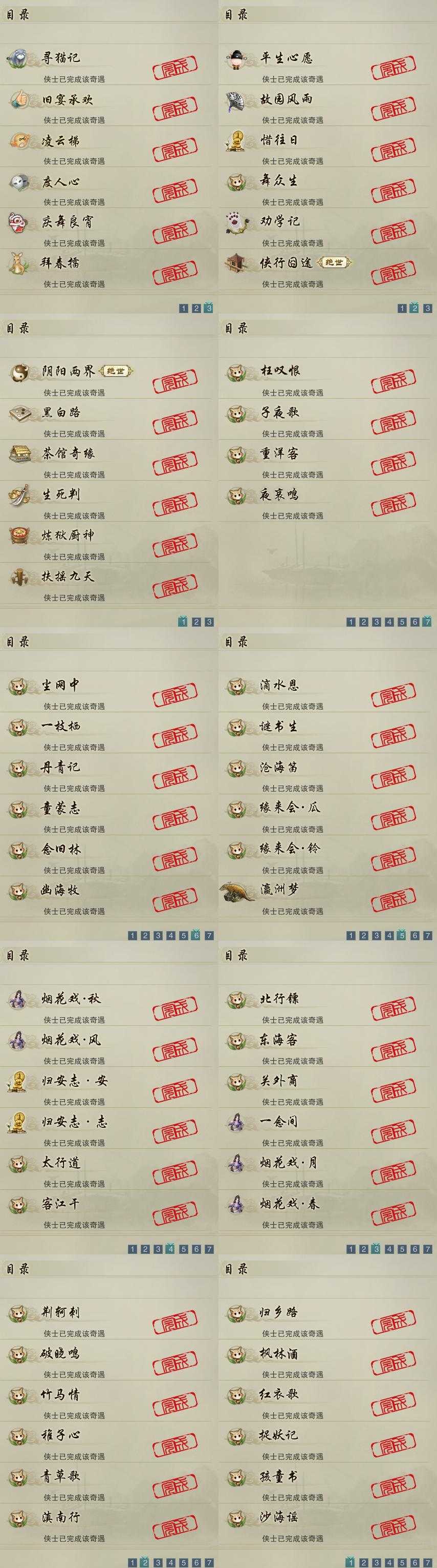 【奇遇】18个[劝学记, 阴阳两界, 平生心愿, 黑白路, 惜往日, 故园风雨, 扶摇九天, 舞众生, 寻猫记, 侠行囧途, 茶馆奇缘, 庆舞良宵, 生死判, 凌云梯, 炼狱厨神, 度人心, 旧宴承欢, 拜春擂]