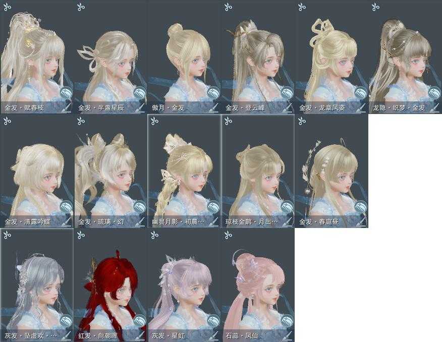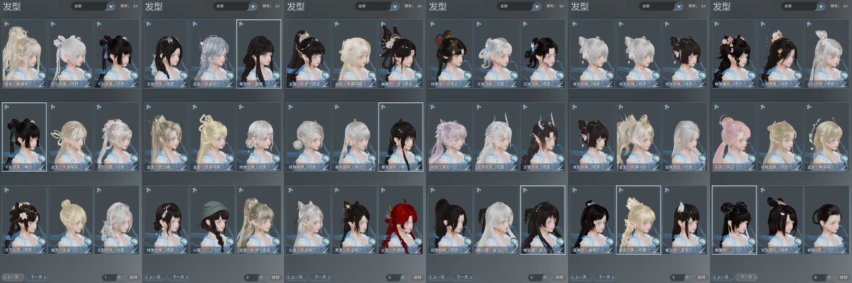 【发型】金发11个[鼠金, 海金, 水母金, 龙金, 三代金, 傲月金发, 精灵金, 蛇金, 澄琼枝金发, 金幽昙金发, 白龙隐金发], 红发4个[十四红, 凤仙粉, 二代灰, 三代灰银], 黑发24个, 白发15个, 盒子发型[绿人间黑发, 羊盒黑发, 紫忘川白发, 羊盒白发, 黑傣族黑发, 蓝钻石盒黑发, 粉钻石盒黑发, 黑椿山黑发, 金鳞盒白发, 红白妖眸盒黑发, 蓝钻石盒白发, 灵龙盒黑发, 粉钻石盒白发, 蓝兔盒黑发, 黑椿山白发, 灵龙白发, 红持君盒黑发, 蓝兔盒白发, 白八中黑发, 白幽馥黑发, 白龙隐黑发, 白八中白发, 六代重阳白发, 婚纱盒黑发, 白鹭黑发, 婚纱盒白发, 九七黑发, 绿千山黑发, 九七白发, 蓝千山黑发, 蓝千山白发], 总页数6